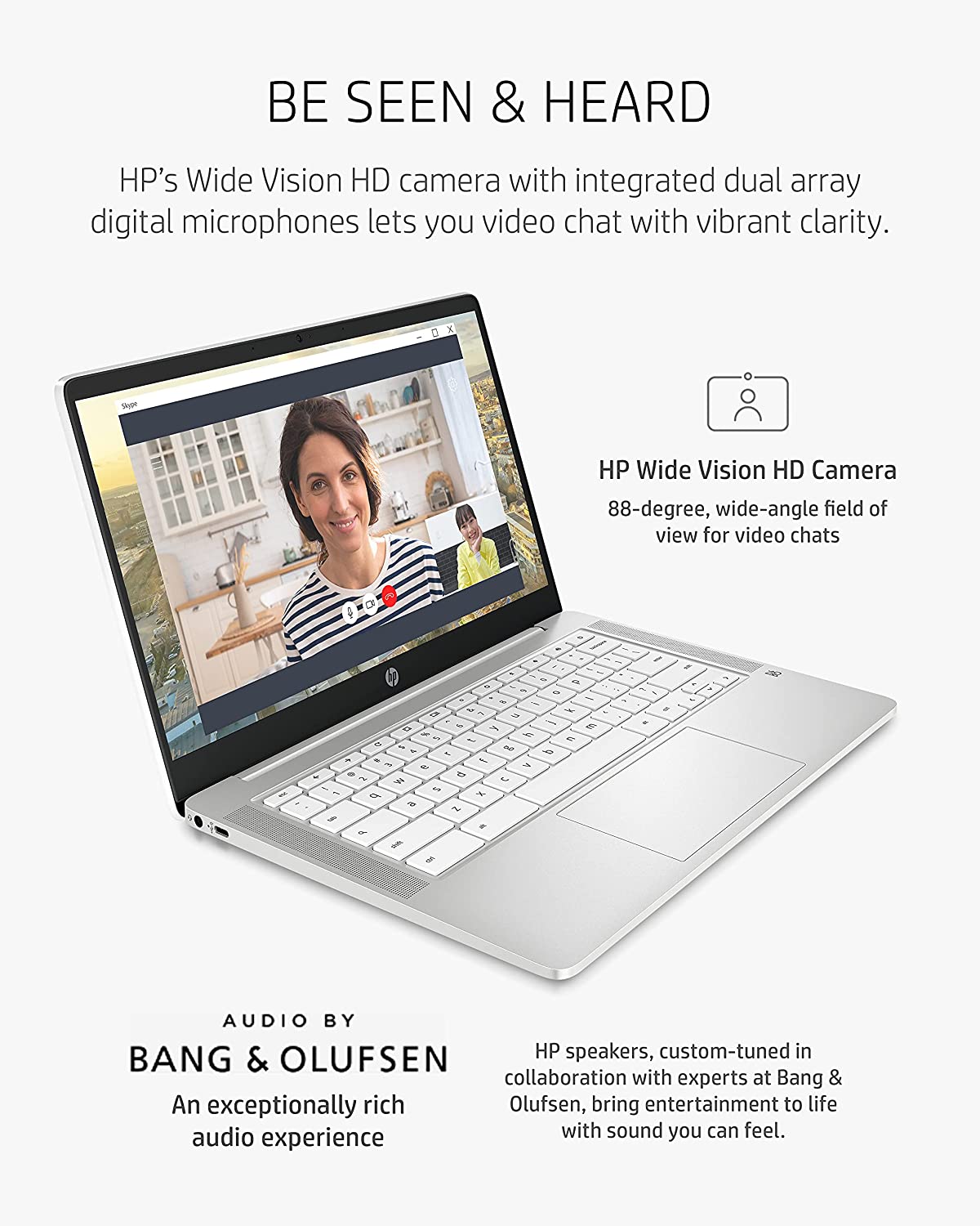 The HP Chromebook empowers you to work more efficiently from the comfort of your own home. The 14” HD (1366 x 768) micro-edge, anti-glare (1) display makes images appear crisp. With Intel® Celeron® N4000 (2) processing power and Intel® UHD Graphics 600 (3), binge watching, gaming, and music are taken to new heights. Securely storing and quickly accessing your work is a breeze with 32 GB eMMC storage (4) and 4 GB of RAM. Work and entertainment doesn’t have to end with up to 13 hours and 30 minutes of streaming power (5) with mixed usage. The Chrome operating system lets you effortlessly navigate through tabs and programs. Your Chromebook is protected with HP’s 1-year limited hardware warranty. Easily communicate with colleagues and friends with the HP Wide Vision HD camera (6) with integrated dual array digital microphones. The Wi-Fi® 5 (2x2) and Bluetooth® 5.0 combo (7) keeps your connection clear so you can continue to work with efficiency. This lightweight computer is 3.24lbs (8), allowing you to easily store it in your Chromebook case for on-the-go use. Reduce your carbon footprint by working with HP ENERGY STAR® certified (9) and EPEAT® Silver registered (10) computers. (1) High-definition (HD) content is required to view high definition images. (2) Multi-core is designed to improve performance of certain software products. Not all customers or software applications will necessarily benefit from use of this technology. Performance and clock frequency will vary depending on application workload and your hardware and software configurations. Intel’s numbering, branding and/or naming is not a measurement of higher performance. Intel, Pentium, Intel Core, Celeron, Iris Xe, Intel logo and the Intel Inside logo are trademarks of Intel Corporation in the U.S. and other countries. (3) Shared video memory (UMA) uses part of the total system memory for video performance. System memory dedicated to video performance is not available for other use by other programs. (4) For storage drives, GB = 1 billion bytes. Actual formatted capacity is less. Portion of internal system storage is reserved and not user accessible. (5) Testing conducted by HP using Google Chrome OS power LoadTest. Battery life will vary and the maximum capacity of the battery will naturally decrease with time and usage. See chromium.org/chromium-os/testing/power-testing for test details. (6) Features may require software or other 3rd party applications to provide the described functionality. Internet service required and not included. (7) Wireless access point and internet service required and sold separately. Availability of public wireless access points limited. Wi-Fi 5 (802.11ac) is backwards compatible with prior Wi-Fi 5 specs. Bluetooth® is a trademark owned by its proprietor and used by Hewlett-Packard Company under license. (8) Weight and system dimensions may fluctuate due to configuration and manufacturing variances. (9) ENERGY STAR and the ENERGY STAR mark are registered trademarks owned by the U.S. Environmental Protection Agency. (10) Based on U.S. EPEAT® registration according to IEEE 1680.1-2018 EPEAT®. EPEAT® status varies by country. Visit www.epeat.net for more information. High-definition (HD) content is required to view high definition images.