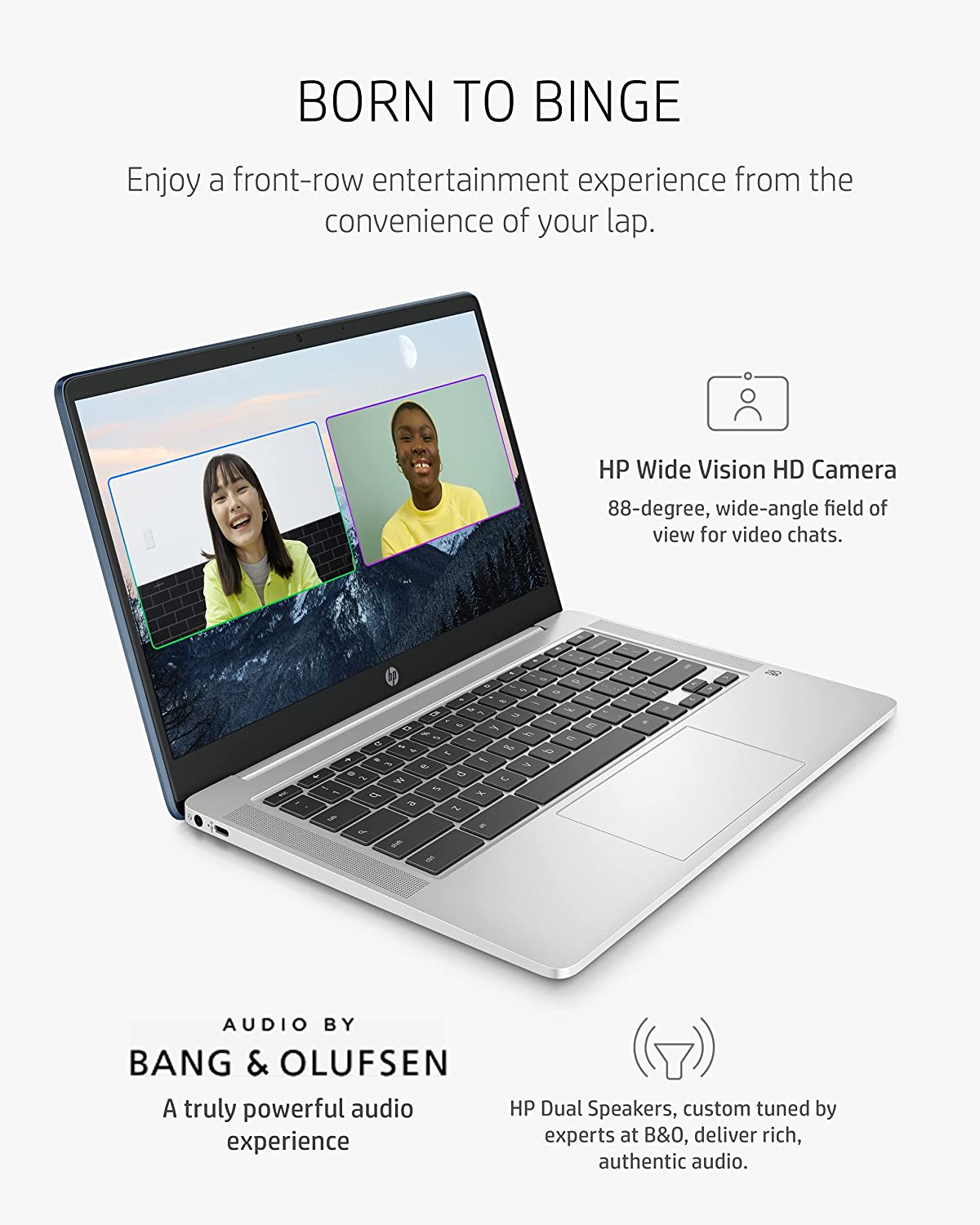 The HP Chromebook 14 Laptop empowers you to complete your tasks faster thanks to its responsive processor, ample storage, and apps for everything. With its 14-inch HD (1366 x 768), micro-edge, BrightView display (1), images appear more immersive than ever before. An Intel® Celeron processor (2) and visuals powered by UHD Graphics 600 (3), empowers you to complete your work seamlessly; then, kick back and relax while binge watching all your favorite shows. Storing assignments, presentations, and homework is hassle-free with 32 GB eMMC (4) storage; accessing your files is even faster with the laptop’s 4 GB of RAM. Plus, you can enjoy front-row-quality entertainment longer thanks to the computer’s long battery life of up to 14 hours with mixed usage (5). The Chrome operating system benefits from Google’s continually improved security measures, allowing your work to stay protected while you navigate through the web. Video chatting with colleagues, friends, and family becomes crystal-clear with the help of the HP Wide Vision 720p HD camera and integrated dual-array digital microphones (6). The included Wi-Fi 5 (2x2) and Bluetooth® 5.0 combo (7) allows your Chromebook 14 to maintain its rock solid internet connections. With its intuitive touchscreen, the 14-inch computer allows you to zoom, pinch, and swipe your content right from the screen (1) for enhanced productivity. The Chromebook laptop meets the criteria for energy efficiency, as well. HP’s 14” Chromebook is ENERGY STAR® certified (8) and EPEAT® Silver registered (9), making it safe for the environment. (1) High-definition (HD) content is required to view high definition images. (2) Multi-core is designed to improve performance of certain software products. Not all customers or software applications will necessarily benefit from use of this technology. (3) Shared video memory (UMA) uses part of the total system memory for video performance. System memory dedicated to video performance is not available for other use by other programs. (4) For storage drives, GB = 1 billion bytes. Actual formatted capacity is less. Portion of internal system storage is reserved and not user accessible. (5)Testing conducted by HP using Google Chrome OS power LoadTest. Battery life will vary and the maximum capacity of the battery will naturally decrease with time and usage. See chromium.org/chromium-os/testing/power-testing for test details. (6) Features may require software or other 3rd party applications to provide the described functionality. Internet service required and not included. (7) Wireless access point and internet service required and sold separately. Availability of public wireless access points limited. Wi-Fi 5 (802.11ac) is backwards compatible with prior Wi-Fi 5 specs.Bluetooth® is a trademark owned by its proprietor and used by Hewlett-Packard Company under license. (8) ENERGY STAR and the ENERGY STAR mark are registered trademarks owned by the U.S. Environmental Protection Agency. (9) Based on U.S. EPEAT® registration according to IEEE 1680.1-2018 EPEAT®. EPEAT® status varies by country. Visit www.epeat.net for more information.