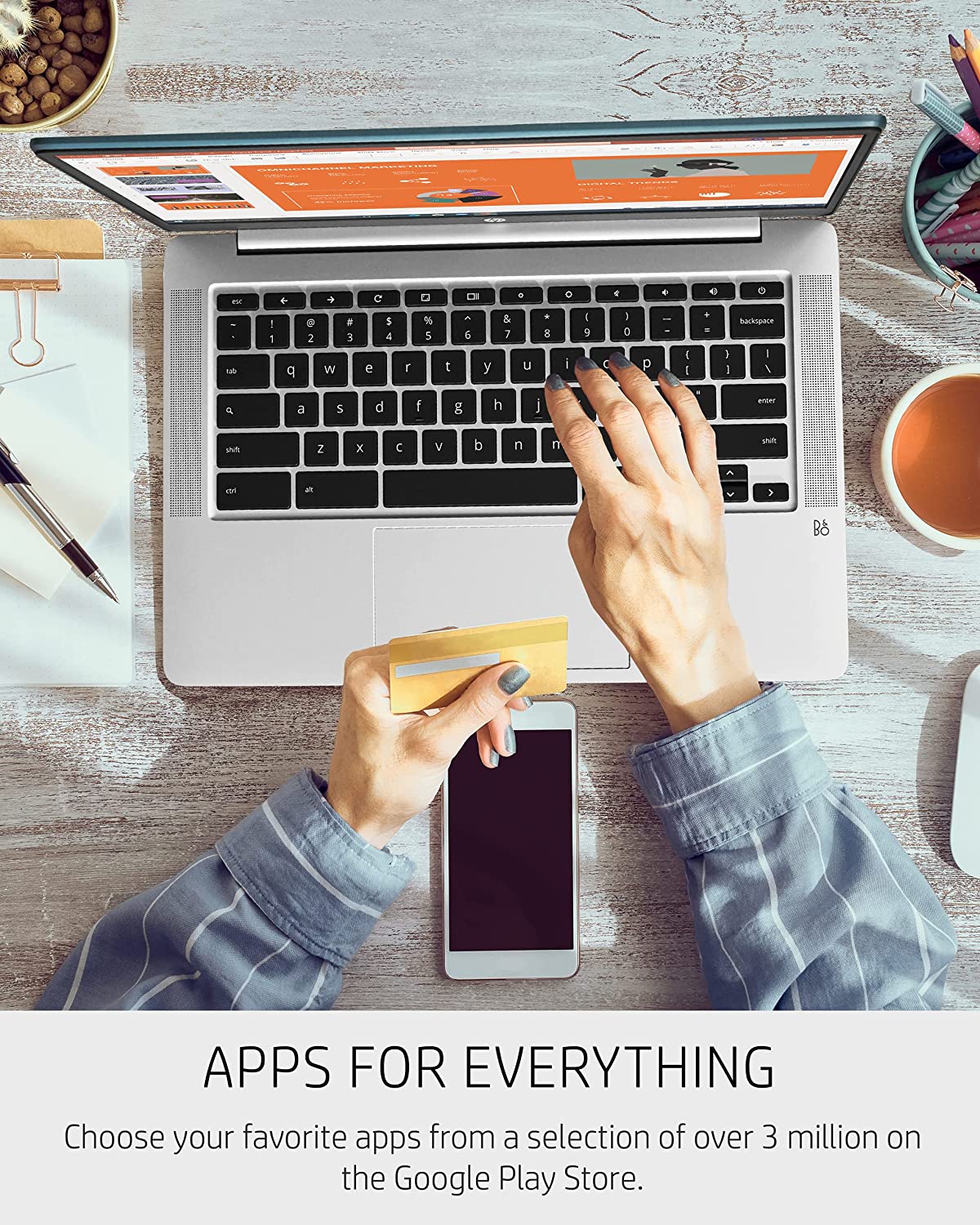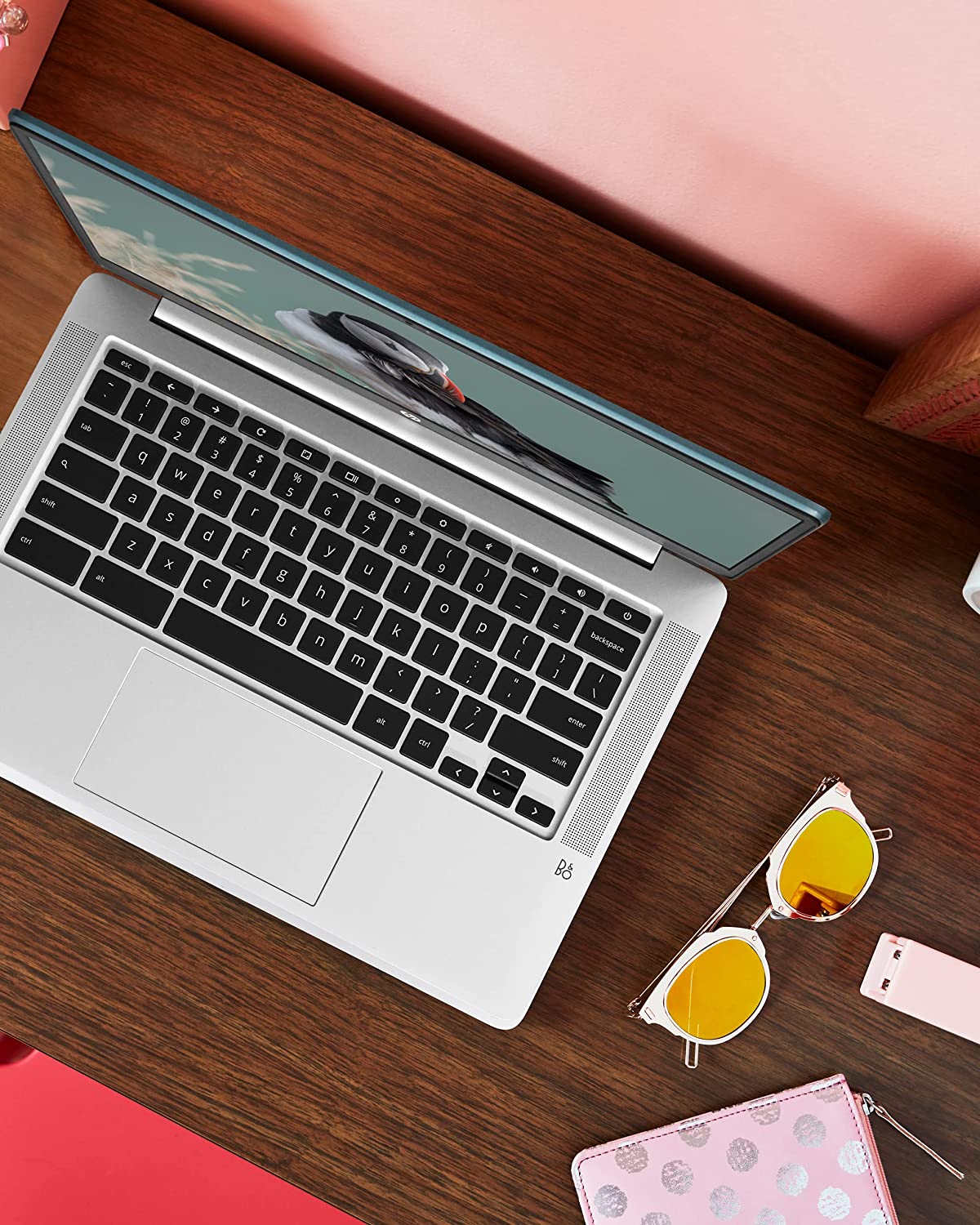 The HP Chromebook 14 Laptop empowers you to complete your tasks faster thanks to its responsive processor, ample storage, and apps for everything. With its 14-inch HD (1366 x 768), micro-edge, BrightView display (1), images appear more immersive than ever before. An Intel® Celeron processor (2) and visuals powered by UHD Graphics 600 (3), empowers you to complete your work seamlessly; then, kick back and relax while binge watching all your favorite shows. Storing assignments, presentations, and homework is hassle-free with 32 GB eMMC (4) storage; accessing your files is even faster with the laptop’s 4 GB of RAM. Plus, you can enjoy front-row-quality entertainment longer thanks to the computer’s long battery life of up to 14 hours with mixed usage (5). The Chrome operating system benefits from Google’s continually improved security measures, allowing your work to stay protected while you navigate through the web. Video chatting with colleagues, friends, and family becomes crystal-clear with the help of the HP Wide Vision 720p HD camera and integrated dual-array digital microphones (6). The included Wi-Fi 5 (2x2) and Bluetooth® 5.0 combo (7) allows your Chromebook 14 to maintain its rock solid internet connections. With its intuitive touchscreen, the 14-inch computer allows you to zoom, pinch, and swipe your content right from the screen (1) for enhanced productivity. The Chromebook laptop meets the criteria for energy efficiency, as well. HP’s 14” Chromebook is ENERGY STAR® certified (8) and EPEAT® Silver registered (9), making it safe for the environment. (1) High-definition (HD) content is required to view high definition images. (2) Multi-core is designed to improve performance of certain software products. Not all customers or software applications will necessarily benefit from use of this technology. (3) Shared video memory (UMA) uses part of the total system memory for video performance. System memory dedicated to video performance is not available for other use by other programs. (4) For storage drives, GB = 1 billion bytes. Actual formatted capacity is less. Portion of internal system storage is reserved and not user accessible. (5)Testing conducted by HP using Google Chrome OS power LoadTest. Battery life will vary and the maximum capacity of the battery will naturally decrease with time and usage. See chromium.org/chromium-os/testing/power-testing for test details. (6) Features may require software or other 3rd party applications to provide the described functionality. Internet service required and not included. (7) Wireless access point and internet service required and sold separately. Availability of public wireless access points limited. Wi-Fi 5 (802.11ac) is backwards compatible with prior Wi-Fi 5 specs.Bluetooth® is a trademark owned by its proprietor and used by Hewlett-Packard Company under license. (8) ENERGY STAR and the ENERGY STAR mark are registered trademarks owned by the U.S. Environmental Protection Agency. (9) Based on U.S. EPEAT® registration according to IEEE 1680.1-2018 EPEAT®. EPEAT® status varies by country. Visit www.epeat.net for more information.
