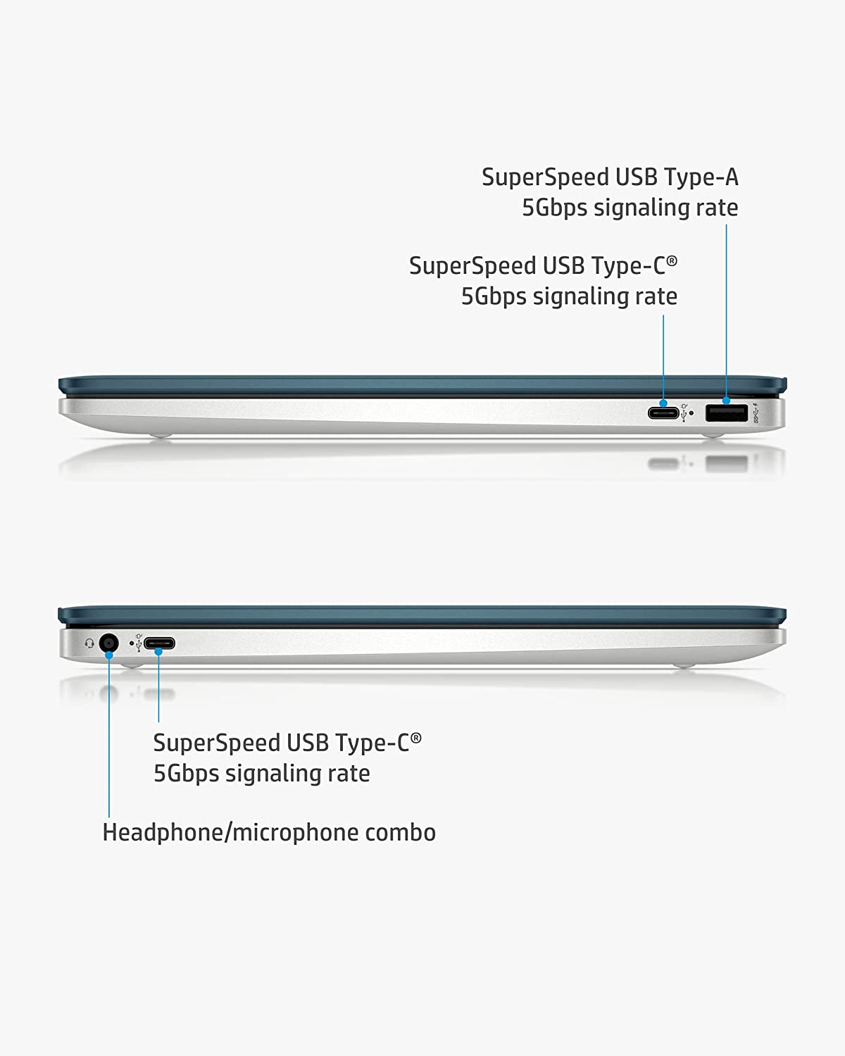 The HP Chromebook 14 Laptop empowers you to complete your tasks faster thanks to its responsive processor, ample storage, and apps for everything. With its 14-inch HD (1366 x 768), micro-edge, BrightView display (1), images appear more immersive than ever before. An Intel® Celeron processor (2) and visuals powered by UHD Graphics 600 (3), empowers you to complete your work seamlessly; then, kick back and relax while binge watching all your favorite shows. Storing assignments, presentations, and homework is hassle-free with 32 GB eMMC (4) storage; accessing your files is even faster with the laptop’s 4 GB of RAM. Plus, you can enjoy front-row-quality entertainment longer thanks to the computer’s long battery life of up to 14 hours with mixed usage (5). The Chrome operating system benefits from Google’s continually improved security measures, allowing your work to stay protected while you navigate through the web. Video chatting with colleagues, friends, and family becomes crystal-clear with the help of the HP Wide Vision 720p HD camera and integrated dual-array digital microphones (6). The included Wi-Fi 5 (2x2) and Bluetooth® 5.0 combo (7) allows your Chromebook 14 to maintain its rock solid internet connections. With its intuitive touchscreen, the 14-inch computer allows you to zoom, pinch, and swipe your content right from the screen (1) for enhanced productivity. The Chromebook laptop meets the criteria for energy efficiency, as well. HP’s 14” Chromebook is ENERGY STAR® certified (8) and EPEAT® Silver registered (9), making it safe for the environment. (1) High-definition (HD) content is required to view high definition images. (2) Multi-core is designed to improve performance of certain software products. Not all customers or software applications will necessarily benefit from use of this technology. (3) Shared video memory (UMA) uses part of the total system memory for video performance. System memory dedicated to video performance is not available for other use by other programs. (4) For storage drives, GB = 1 billion bytes. Actual formatted capacity is less. Portion of internal system storage is reserved and not user accessible. (5)Testing conducted by HP using Google Chrome OS power LoadTest. Battery life will vary and the maximum capacity of the battery will naturally decrease with time and usage. See chromium.org/chromium-os/testing/power-testing for test details. (6) Features may require software or other 3rd party applications to provide the described functionality. Internet service required and not included. (7) Wireless access point and internet service required and sold separately. Availability of public wireless access points limited. Wi-Fi 5 (802.11ac) is backwards compatible with prior Wi-Fi 5 specs.Bluetooth® is a trademark owned by its proprietor and used by Hewlett-Packard Company under license. (8) ENERGY STAR and the ENERGY STAR mark are registered trademarks owned by the U.S. Environmental Protection Agency. (9) Based on U.S. EPEAT® registration according to IEEE 1680.1-2018 EPEAT®. EPEAT® status varies by country. Visit www.epeat.net for more information.