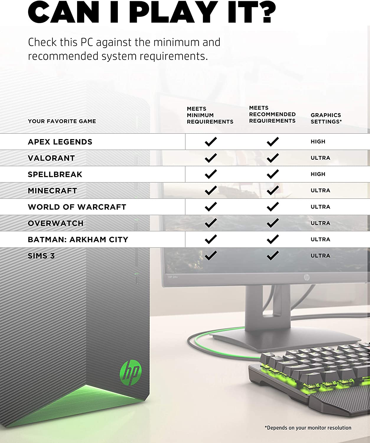 Game on your own terms with the HP Pavilion Gaming Desktop. This gaming tower has all the space you need to easily expand or upgrade, letting you keep up with the games of tomorrow. Personalize your gaming pc in the OMEN Command Center as you manage your machine’s key metrics and customize the chassis lighting. Intel’s powerful 10th Generation processor with a Max Turbo Frequency of 4.30 GHz delivers smooth and outstanding 4k visuals. Your gaming and streaming will never be the same because your HP desktop boasts an NVIDIAⓇ GeForceⓇ GTX 1650 SUPER™ graphics card and 4 GB GDDR6 dedicated memory. PCIe® NVMe™ SSD Storage makes your gaming pc desktop 10x faster than a traditional hard drive while 8 GB DDR4 memory gives a boost to your browsing and multitasking. Your setup has never been more modern with the Windows 10 operating system, USB wired mouse and keyboard combo, and smoother wireless experience with both Wi-Fi 5 and Bluetooth® 4.2. Easily pair your HP Pavilion Gaming Desktop with a MU-MIMO router for a smoother online experience in multi-device homes. Play care-free with a 1-year limited hardware warranty. Introducing Windows 11 (1) Windows 11 is coming! A new Windows experience, bringing you closer to the people and things you love. Get a sneak peek now! (1) Upgrade rollout plan is being finalized and is scheduled to begin late in 2021 and continue into 2022. Specific timing will vary by device. Certain features require specific hardware.