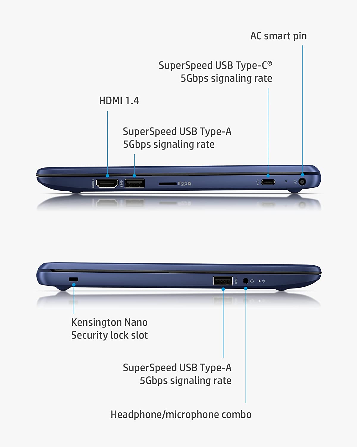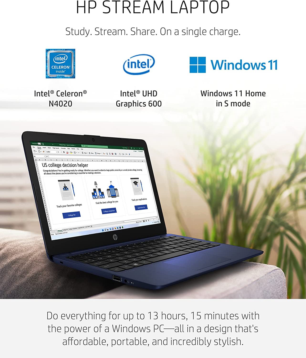 Live your best life on the go and in style with the slim and expressive HP Stream 11 Laptop. With its smooth finish, vertical brushed pattern, and pop of Royal Blue color, this windows laptop perfectly fits your personality. The design isn't only for looks; the ultra-thin laptop is super portable and its high-definition display contains an anti-glare panel—perfect for travel and computing out in the sun (1). This affordable HP laptop features powerful and reliable hardware, such as the dual-core Intel® Celeron® N4020 processor (2) and Intel® UHD Graphics 600 (3). Plus, with an embedded Multimedia Card, you’ll enjoy 64 GB of storage for greater content security, fewer moving parts, and at a great value (4). Additionally, experience a boost to your 11.6-inch laptop’s overall performance and bandwidth thanks to 4 GB of RAM. And with up to 13 hours and 15 minutes of battery life, you’ll enjoy all that processing power and storage options from the start of your workday to the end of your evening streaming (5). Experience quicker boot-ups and strong protection against phishing and malware with the Windows 11 Home in S Mode (6). Plus, your device's 1-year limited hardware warranty provides even more peace of mind. Whether you’re at home, the office, or in class, the dependable Realtek RTL8822CE 802.11a/b/g/n/ac (2x2) Wi-Fi® (7) and Bluetooth® 5.0 (8) combo is just the solution for preventing unwanted connection drops or waiting on endless load screens. Take advantage of a free 1-year subscription to Microsoft 365 and utilize the many new smart assistance tools and other creativity promoting features this HP laptop computer has to offer (9). Stay productive anywhere while shrinking your carbon footprint with a PC laptop that's not only built with sustainability in mind, but is also ENERGY STAR® certified (10) and EPEAT® Silver registered (11). (1) High-definition (HD) content is required to view high-definition images. (2) Multi-core is designed to improve the performance of certain software products. Not all customers or software applications will necessarily benefit from the use of this technology. Performance and clock frequency will vary depending on application workload and your hardware and software configurations. Intel’s numbering, branding, and/or naming is not a measurement of higher performance. Intel, Pentium, Intel Core, Celeron, Iris Xe, Intel logo, and the Intel Inside logo are trademarks of Intel Corporation in the U.S. and other countries. (3) Shared video memory (UMA) uses part of the total system memory for video performance. System memory dedicated to video performance is not available for other use by other programs. (4) For storage drives, GB = 1 billion bytes. The actual formatted capacity is less. Up to 5.1GB of disk is reserved for system recovery software. (5) Battery life tested by HP using continuous FHD video playback, 1080p (1920x1080) resolution, 150 nits brightness, system audio level at 17%, player audio level at 100%, played full-screen from local storage, headphone attached, wireless on but not connected. Actual battery life will vary depending on configuration and maximum capacity will naturally decrease with time and usage. (6) Not all features are available in all editions or versions of Windows. Systems may require upgraded and/or separately purchased hardware, drivers, software, or BIOS update to take full advantage of Windows functionality. Windows 11 is automatically updated, which is always enabled. ISP fees may apply and additional requirements may apply over time for updates. See http://www.windows.com. Windows 11 in S mode works exclusively with apps from the Microsoft Store within Windows. Certain default settings, features, and apps cannot be changed. Some accessories and apps compatible with Windows 11 may not work (including some antivirus, PDF Writers, driver utilities, and accessibility apps) and performance may vary, even if you switch out of S mode. If you switch to Windows 11, you can’t switch back to S mode. Learn more at Windows.com/SmodeFAQ. (7) Wireless access point and internet service required and sold separately. The availability of public wireless access points is limited. Wi-Fi 5 (802.11ac) is backward compatible with prior Wi-Fi 5 specs. (8) Bluetooth® is a trademark owned by its proprietor and used by HP Inc. under license. (9) Microsoft 365 Personal 1-year subscription included. Activation is required within 180 days of the Windows activation date. Microsoft 365 Family and Microsoft 365 Personal have non-commercial rights and are meant for personal use only. See microsoft.com for full details. (10) ENERGY STAR and the ENERGY STAR mark are registered trademarks owned by the U.S. Environmental Protection Agency. (11) Based on U.S. EPEAT® registration according to IEEE 1680.1-2018 EPEAT®. EPEAT® status varies by country. Visit www.epeat.net for more information.