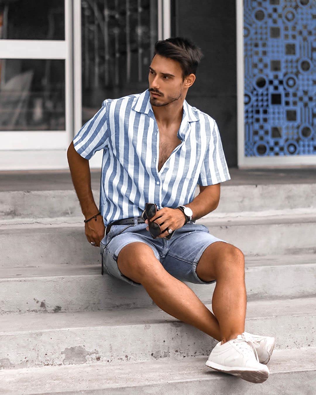 JMIERR Men's Casual Short Sleeve Button-Up Striped Dress Shirts Cotton Shirt