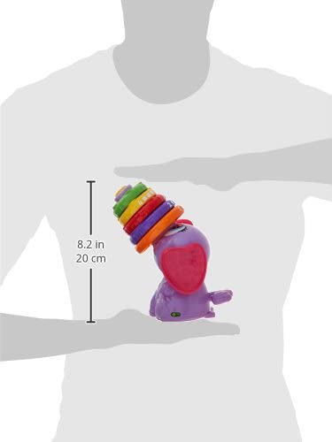 Stacking is tons of fun with the online exclusive purple stack and tumble elephant. Stack the five brightly colored, textured rings on the elephant's trunk. As each ring is placed on the trunk, she will introduce colors, numbers and or shapes. Press the music note button on the elephant's trunk to hear playful songs. Push down on her tail and watch her sneeze, sending the rings tumbling off her trunk. Then play again!