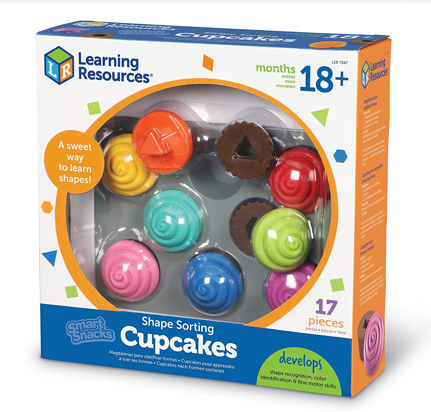 A delicious way to develop shape and color identification. Cupcakes pull apart to reveal shapes. Match the shapes to put them back together. Then match the shape to the pan bottom. Featured shapes align with grade K Common Core Math Standards—circle, square, triangle, rectangle, oval, hexagon, star, and heart. Includes pan and eight 2-part cupcakes measuring 2”H x 1 ½” in diameter. Toddlers Ages 2+.