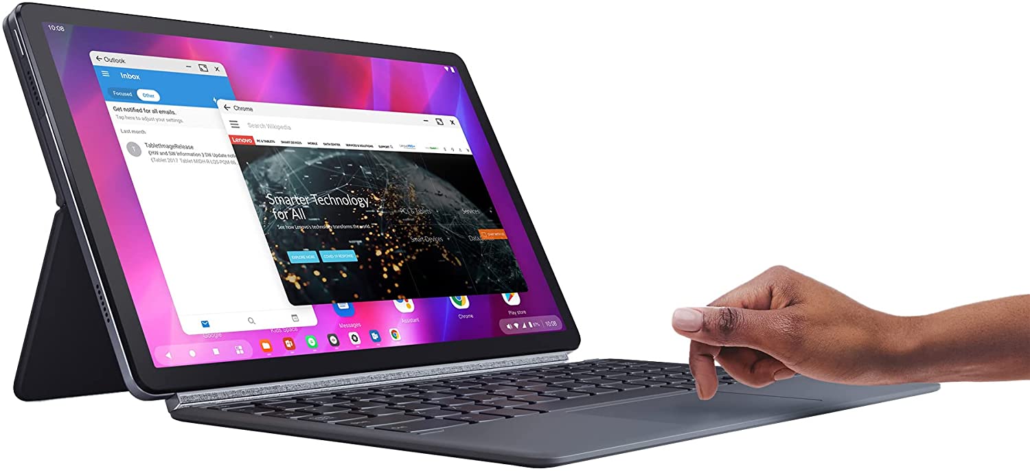 Running the Android™ 11 operating system, the Tab P11 Plus tablet offers Bluetooth® and Wi-Fi wireless connectivity and a USB Type-C™ 2.0 port for data transfer and charging. You can also use the USB-C port to attach a compatible headset. It comes with a detachable keyboard, making it easy to interact with the tablet by typing or using the touch screen. Use the front or rear camera to take photos or enjoy a family video chat – this Android tablet comes with a dual microphone array and quad speakers so you'll experience crisp, clear video and sound. You can even log in quickly and easily with Face Unlock.