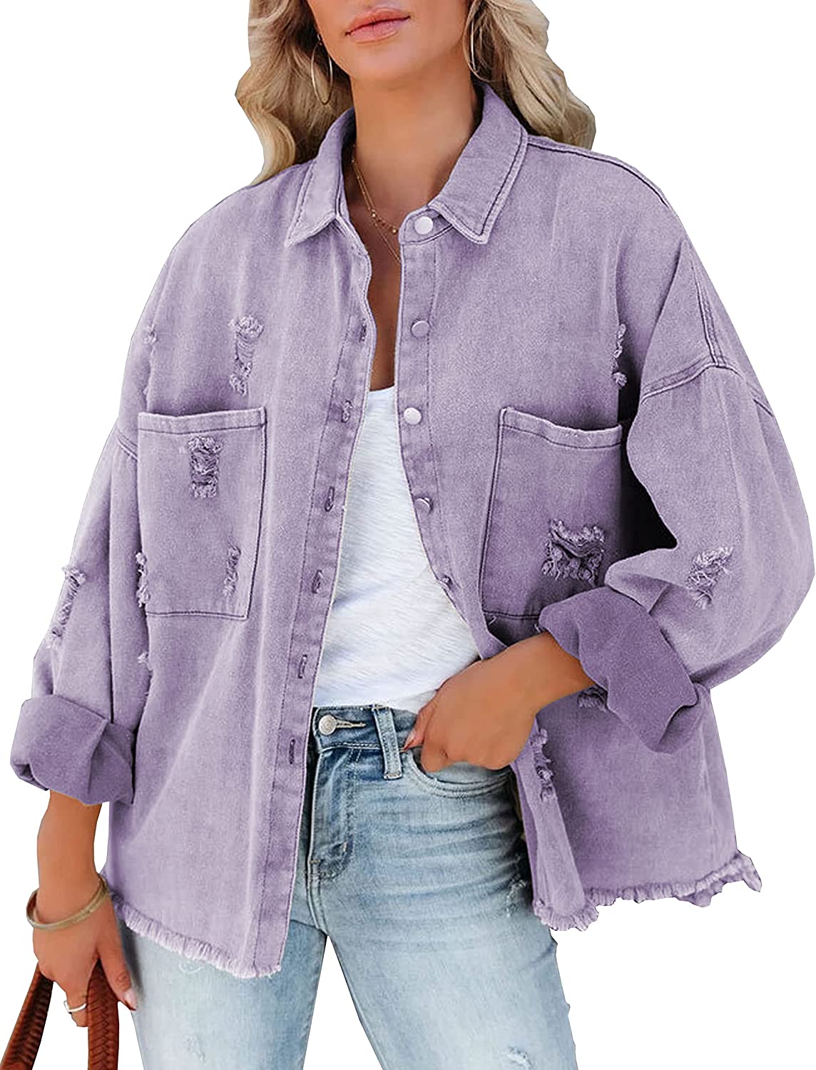 Lumister Womens Causal Oversized Soft Lightweight Distressed Jean Jacket Ripped Fringe Long Sleeve Denim Jacket Shacket