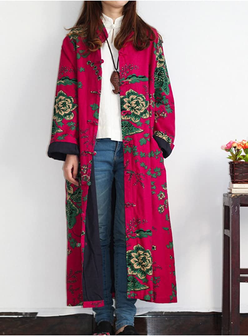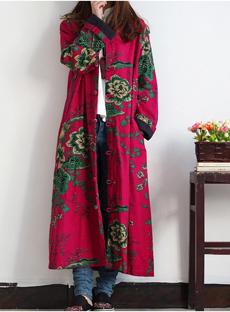 LZJN Women's Cotton Linen Trench Coat Floral Print Long Jacket with Pockets