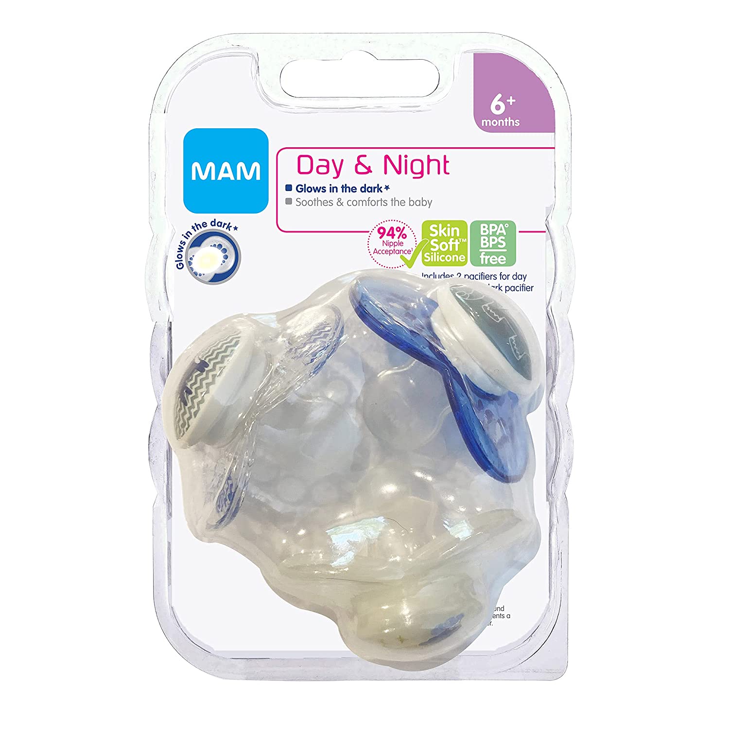 No more frustration trying to find your lost pacifiers at night! This pack includes two cute daytime pacifiers and one that glows in the dark, making it easy for baby and parent to find in the dark. BPA/BPS-free MAM Day & Night Pacifiers were developed by leading pediatric dentists and developmental psychologists to provide maximum comfort and style for babies 6 months of age and older*. These pacifiers combine technological innovation and trendsetting design to help give babies a healthy start in life. MAM pacifiers feature an innovative nipple designed to promote healthy oral development so you can soothe your baby with confidence. Baby will love latching onto the soothing pacifier nipple that, with the help of a built-in air channel, naturally flattens and extends when sucked, mimicking a human nipple during breastfeeding. And all MAM pacifiers are orthodontic, featuring a symmetrical nipple that fits perfectly in baby’s mouth at any angle. MAM’s medically engineered nipples all feature life-like, SkinSoft textured silicone that feels just like mom. With multiple pacifier shapes and shield sizes to pick from, MAM nipples are easily accepted by babies of all ages, with 94% nipple acceptance among babies tested.** Babies simply love the ease and comfort of latching onto MAM nipples. *Developed in conjunction with the International Children’s Medical Research Society. ** Market Research 2009-2017, tested with 1,508 babies.