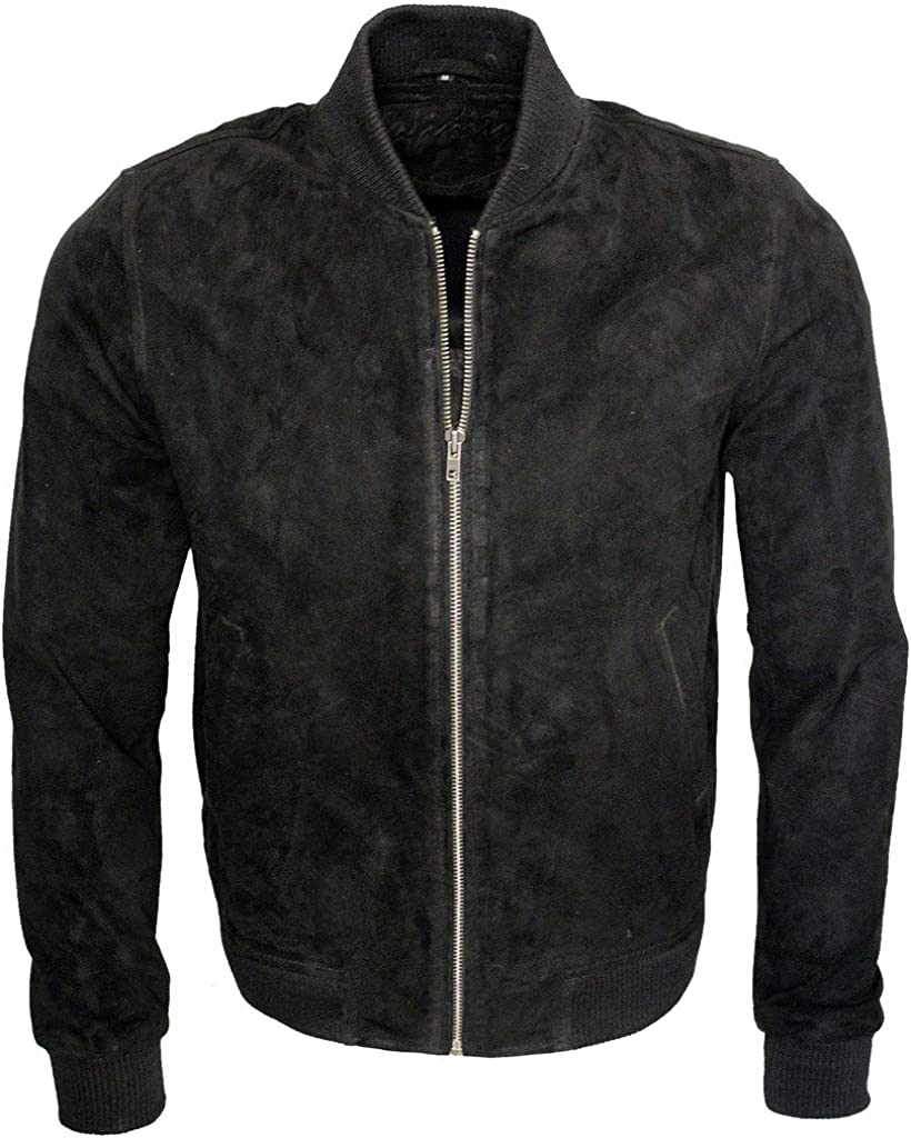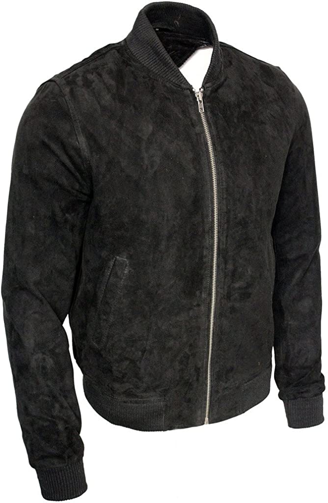 Mens Retro Black Goat Suede Leather Bomber Varsity Jacket