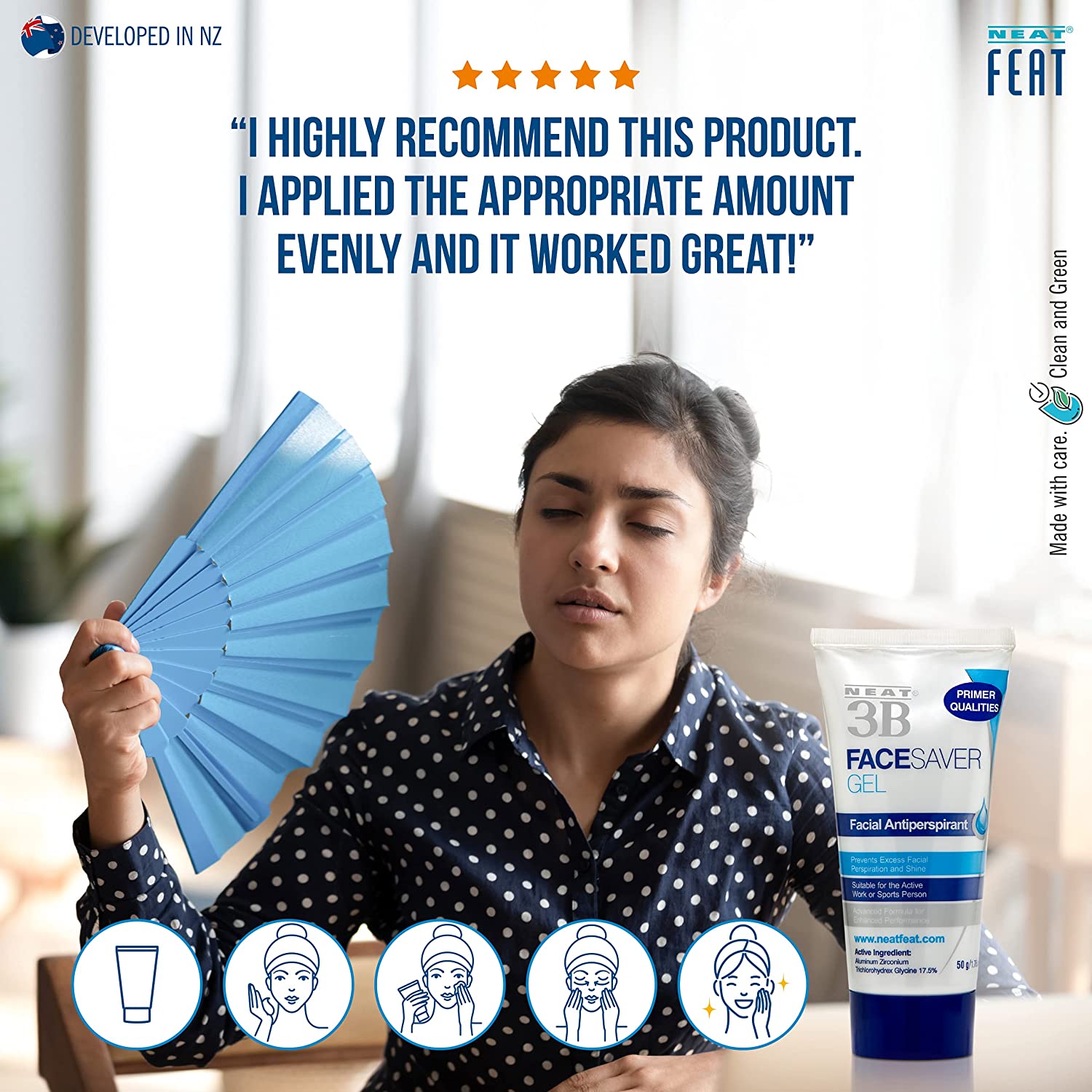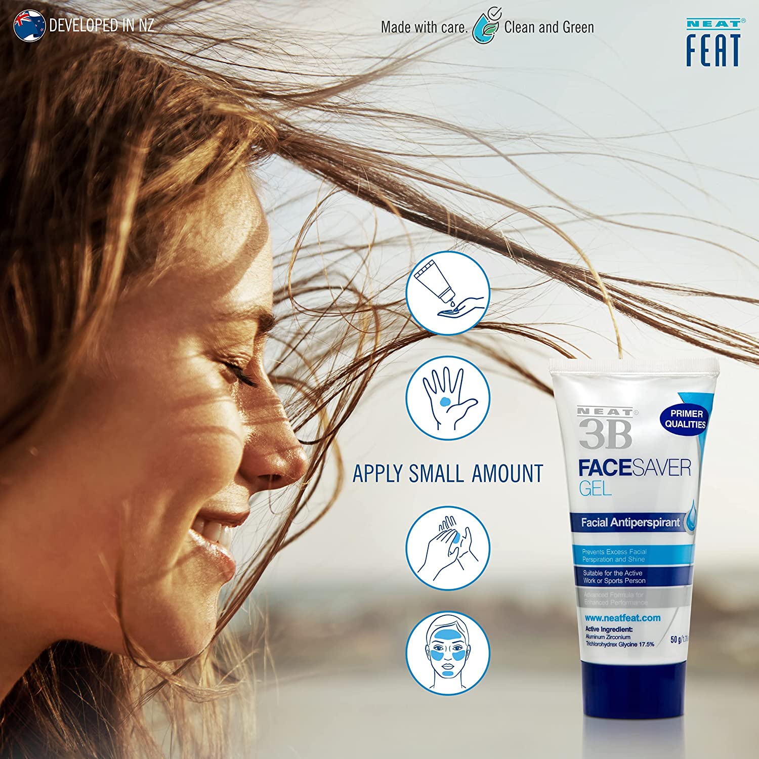 NEAT 3B Face Saver Gel as a lightweight antiperspirant gel which will last several hours. It can be applied to the forehead, upper lip and the back of the neck. It should not be applied on the scalp or on or near the eyes. It is best applied before other facial cosmetics, but may be applied at any time. The product will not affect the production of perspiration from the scalp, but it will help to decrease the amount of perspiration visible on the face.