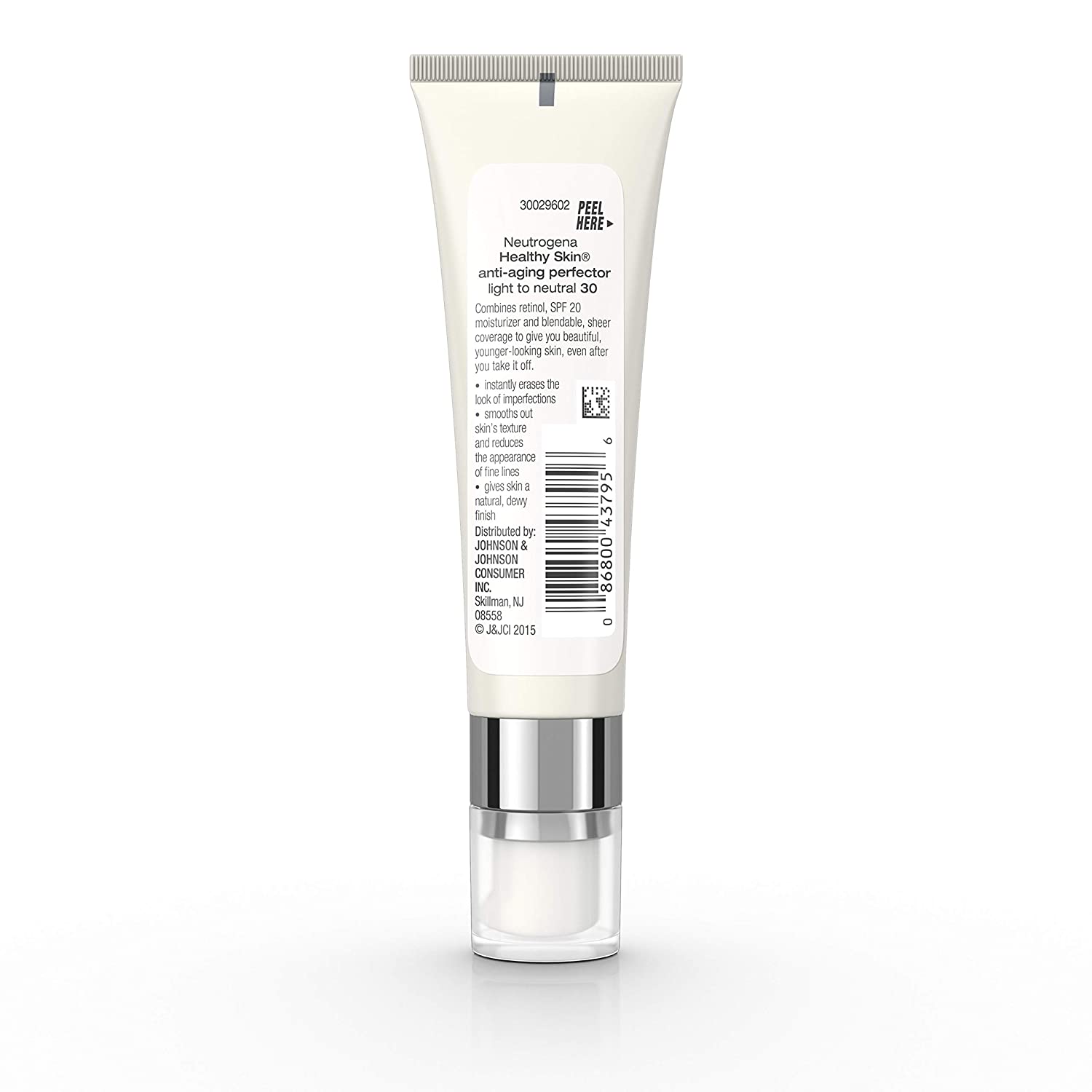 Use Neutrogena Healthy Skin Anti-Aging Perfector Tinted Facial Moisturizer with SPF 20 sunscreen to help reduce the appearance of fine lines. This all-in-one daily moisturizer combines the anti-aging properties of retinol with an SPF 20 moisturizer to offer blendable sheer coverage that helps even tone and smooth skin's texture while protecting against skin-damaging sunrays. This tinted moisturizer is enriched with clinically proven retinol treatment as well as vitamins and antioxidants to fight the appearance of wrinkles even after you take it off. Neutrogena Healthy Skin Anti-Aging Perfector SPF 20 works across skin tones for a natural, dewy finish with sheer coverage.