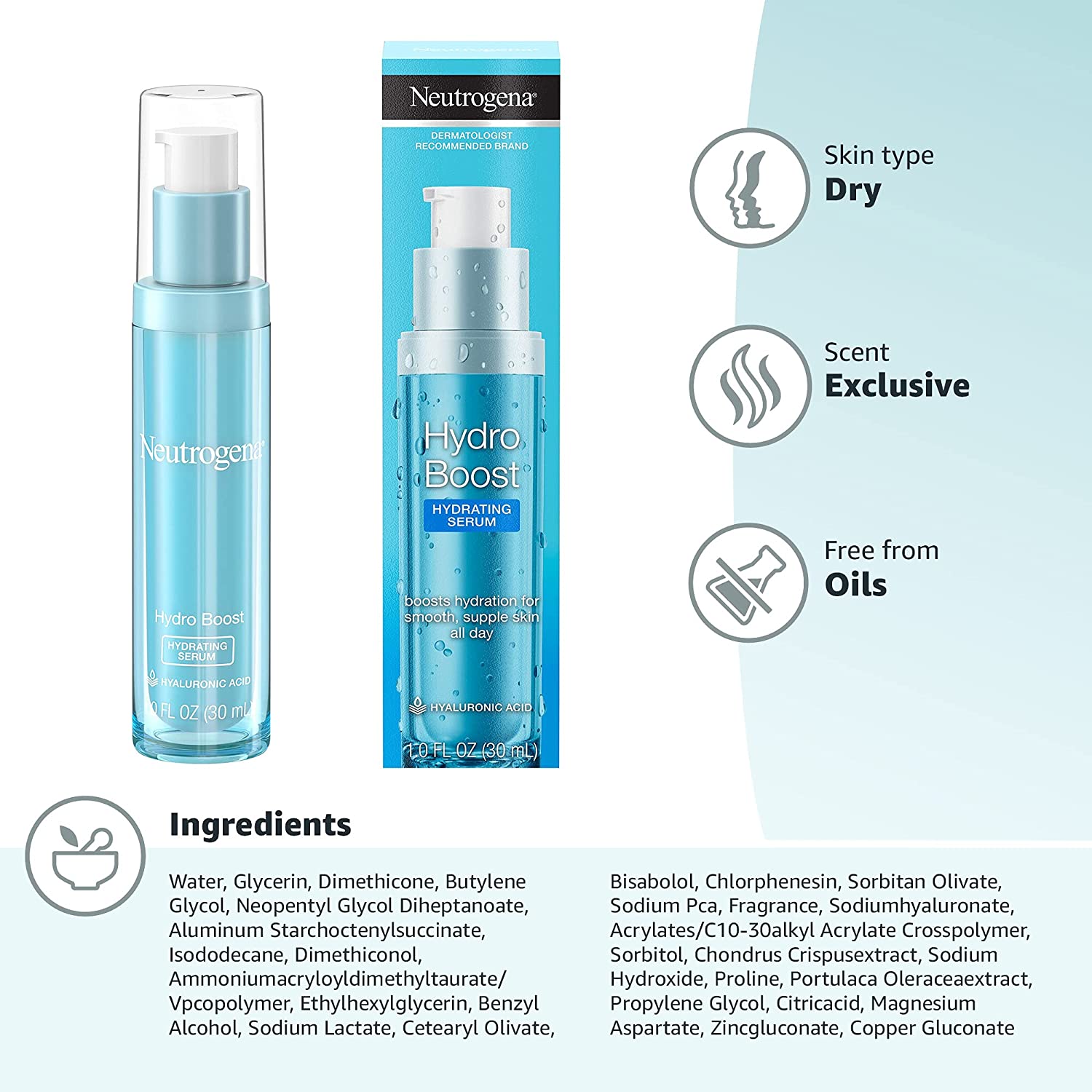 Achieve glowing skin day after day with Neutrogena Hydro Boost Hydrating Hyaluronic Acid Serum. Addressing dryness to deliver hydration, this facial serum formula contains hyaluronic acid, a hydrator found naturally in the skin, attracts moisture and locks it in. The unique hydrating face serum formula helps you achieve a fully hydrated complexion that stays smooth and supple and glows from within. Complete your at-home skincare routine with this oil-free, non-comedogenic gentle serum and pair with other products from the Neutrogena Hydro Boost collection which includes hydrating Hand Cream, Body Gel Cream, Facial Moisturizers and Cleansers.