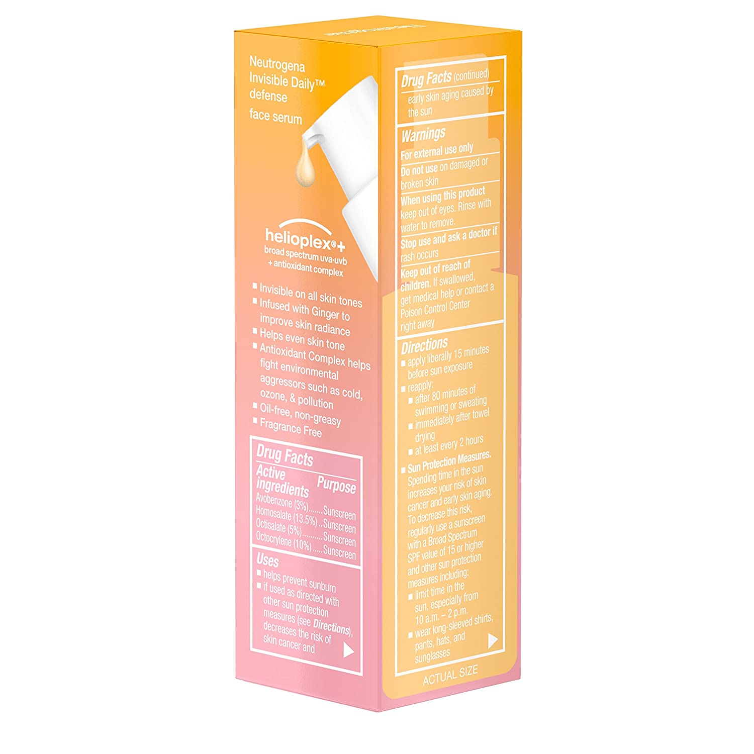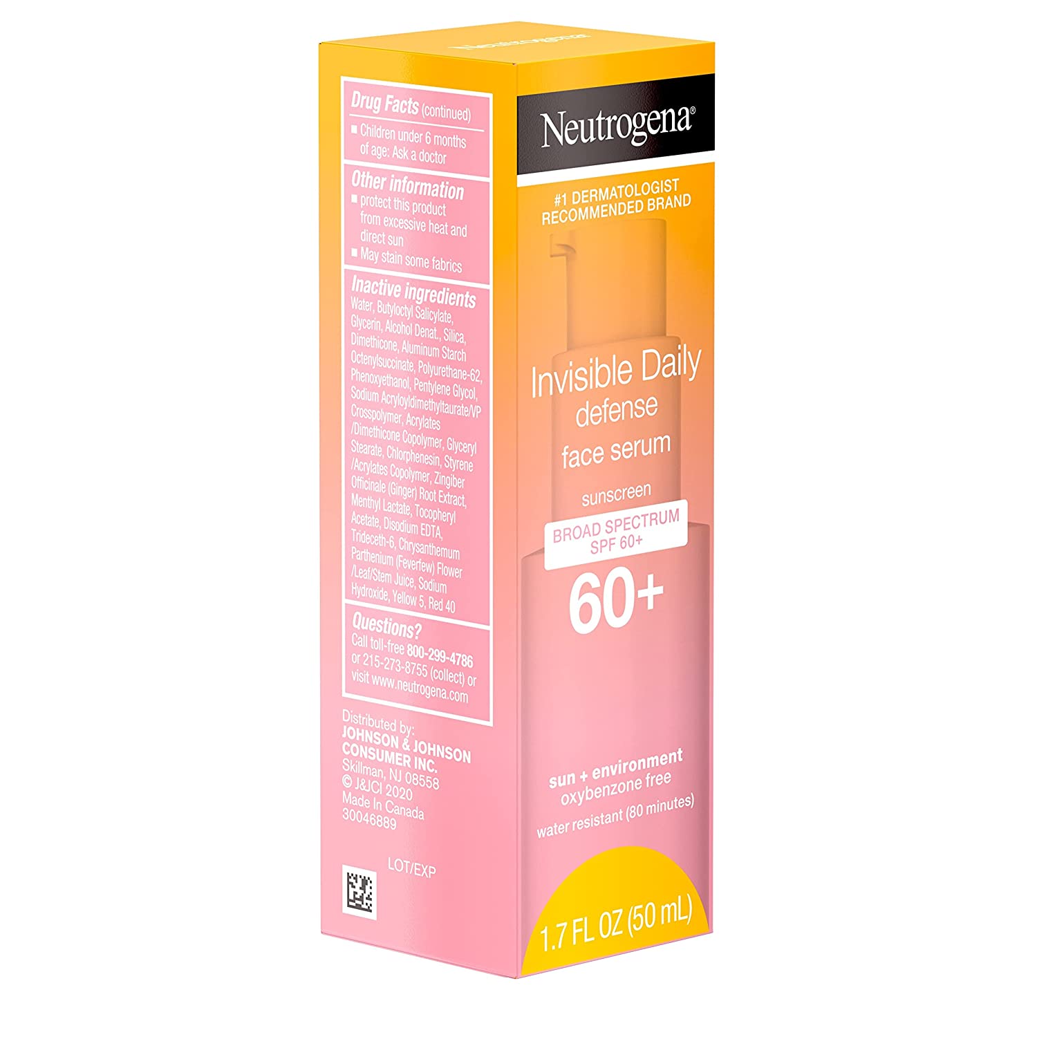 Protect skin from the sun for more radiant skin with Neutrogena Invisible Daily Defense Face Serum with SPF 60+ sunscreen. This oil-free facial serum from the #1 dermatologist recommended sun care brand is invisible on all skin tones and guards against the sun and environmental aggressors while helping even skin tone. The hydrating serum with SPF 60+ helps prevent sunburn with broad spectrum UVA/UVB protection and fights against signs of skin aging due to UV exposure, such as wrinkles, dark spots, fine lines, and sagging. Lightweight and gentle, the skin-hydrating serum is infused with ginger extract to improve skin radiance and an antioxidant complex to help fight environmental factors like cold, ozone, and pollution. The non-greasy serum is invisible on all skin tones and is oxybenzone-, paraben-, oil- and mineral oil-free. Ideal for daily use, the sun care serum is water- and sweat-resistant for up to 80 minutes.