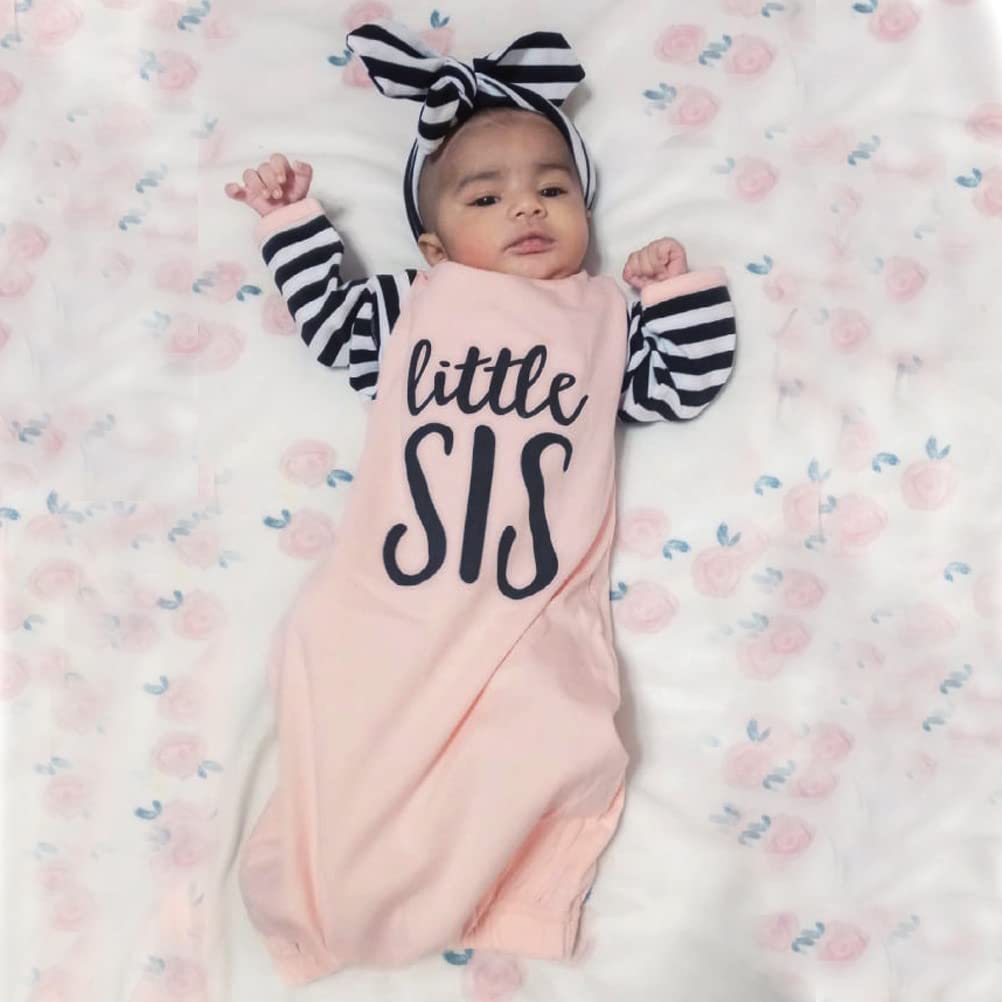 Cute baby nightgowns 0-6 months: "Little Sister" letter print, floral long sleeve design, matching bowknot headband, super fashionable 2pcs baby items newborn essentials in spring summer fall winter.