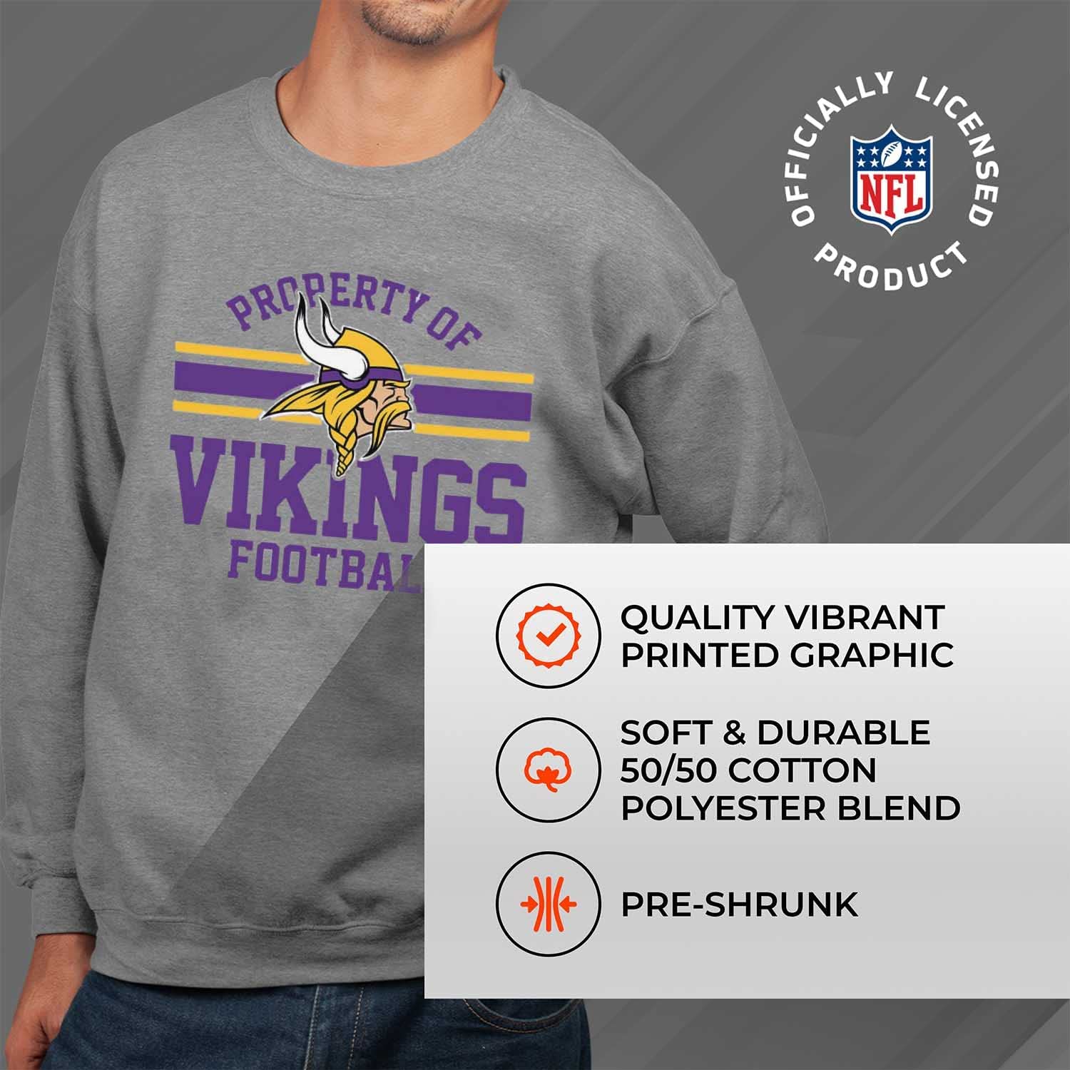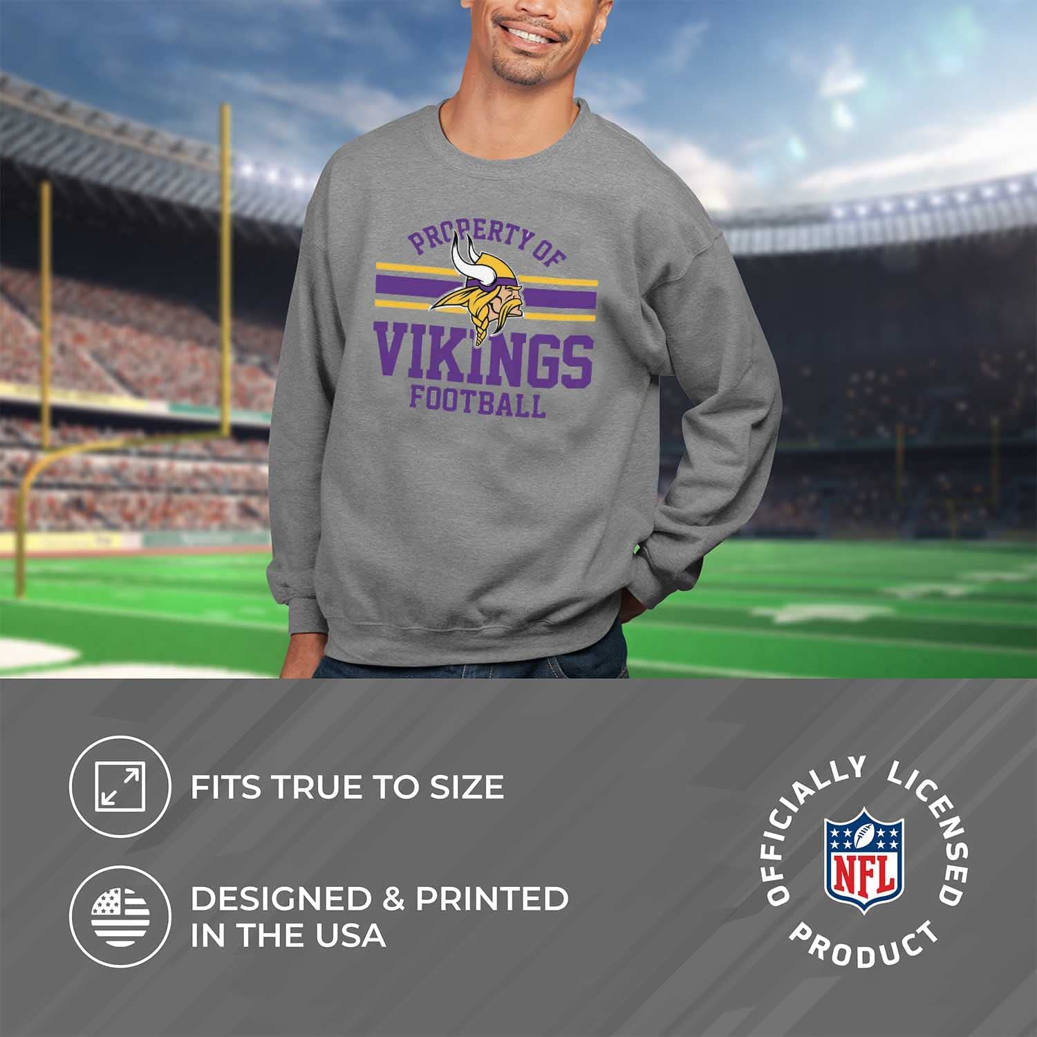 This Property of pullover crewneck sweatshirt is a cold-weather friendly jacket made from 50% ringspun cotton and 50% polyester. Our mens and womens football sweater is super comfortable, runs true to size, and is great for showing your team pride all year long. This comfy crewneck features the official Property of graphics will stay crisp and wear after wear and year after year. All colors and fonts are officially licensed and are of the highest of quality. These crew neck sweatshirts are made with air jet yarn for a softer feel and reduced pilling. This tagless crewneck sweatshirt is perfect for tailgates, games, and showing off your team spirit. Our pullover crewnecks are ideal gifts for men and women football fans. The unisex fit of our crewneck is ideal for both men and women. This crewneck is essential apparel for protecting yourself from the elements at a football game. The fleece material, ribbed cuffs, and waistband keep all the warmth in, which means there's no need for an extra jacket in the fall months– our crew neck sweaters have you covered. This Property of sweatshirt crewneck pullover is pre-shrunk and is ideal for that tailgate or game day when the temperature drops. Our crewneck pro football sweatshirts for women and men help you gear up and get ready to cheer the to victory.