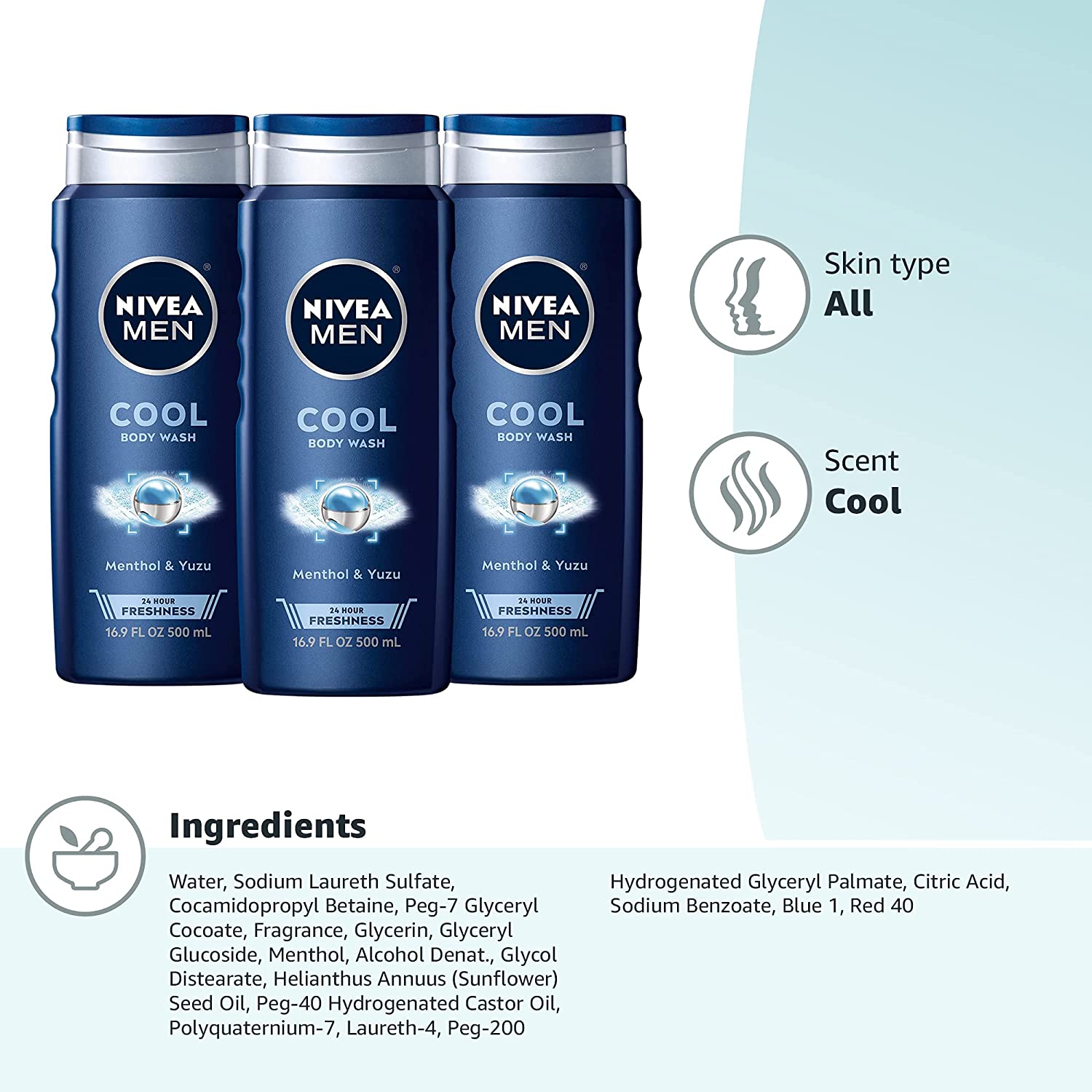 Take care of your skin with NIVEA MEN Cool Body Wash. This body wash gently cleanses and leaves skin feeling comfortable. NIVEA MEN Cool Body Wash is formulated with Menthol for a cool, icy feel. This NIVEA body wash for men can be used for shaving, and as a shampoo and body wash that is specifically crafted for men's skin needs. The refreshing formula does not dry out skin, making it great for everyday use. It is also free of phthalates, parabens and microplastic particles. With a long-lasting masculine scent and icy menthol notes, this body cleanser provides a revitalizing shower experience that leaves skin feeling cared for long after the shower. A refreshing body wash is a key part of a skin care routine and pairs well with NIVEA MEN Maximum Hydration Nourishing Body Lotion. To use, rub scented body wash into a lather while gently massaging over body and rinse.