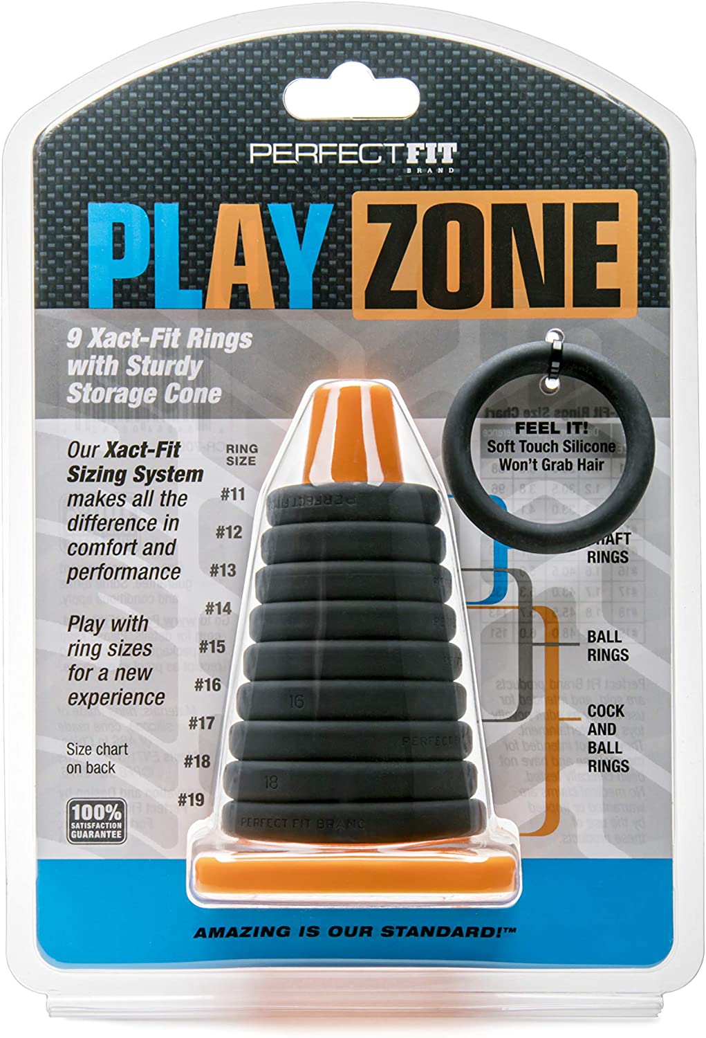 PerfectFit Brand Xact-Fit Play Zone Cock Ring Kit, Stackable, Silicone, Multiple Sizes, Firm Fit, Durable, Set of 9 Rings with Sturdy Storage Cone