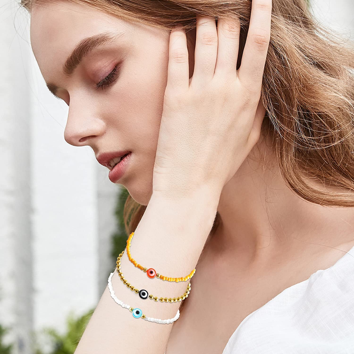 PHUNTTEK 2400pcs Seed Beads and Evil Eye Beads for Jewelry Making, 3mm Glass Seed Beads 8mm Flat Evil Eye Easter Beads Decors Colorful Bracelet Beads Kit for Bracelets Making DIY Beading Supplies