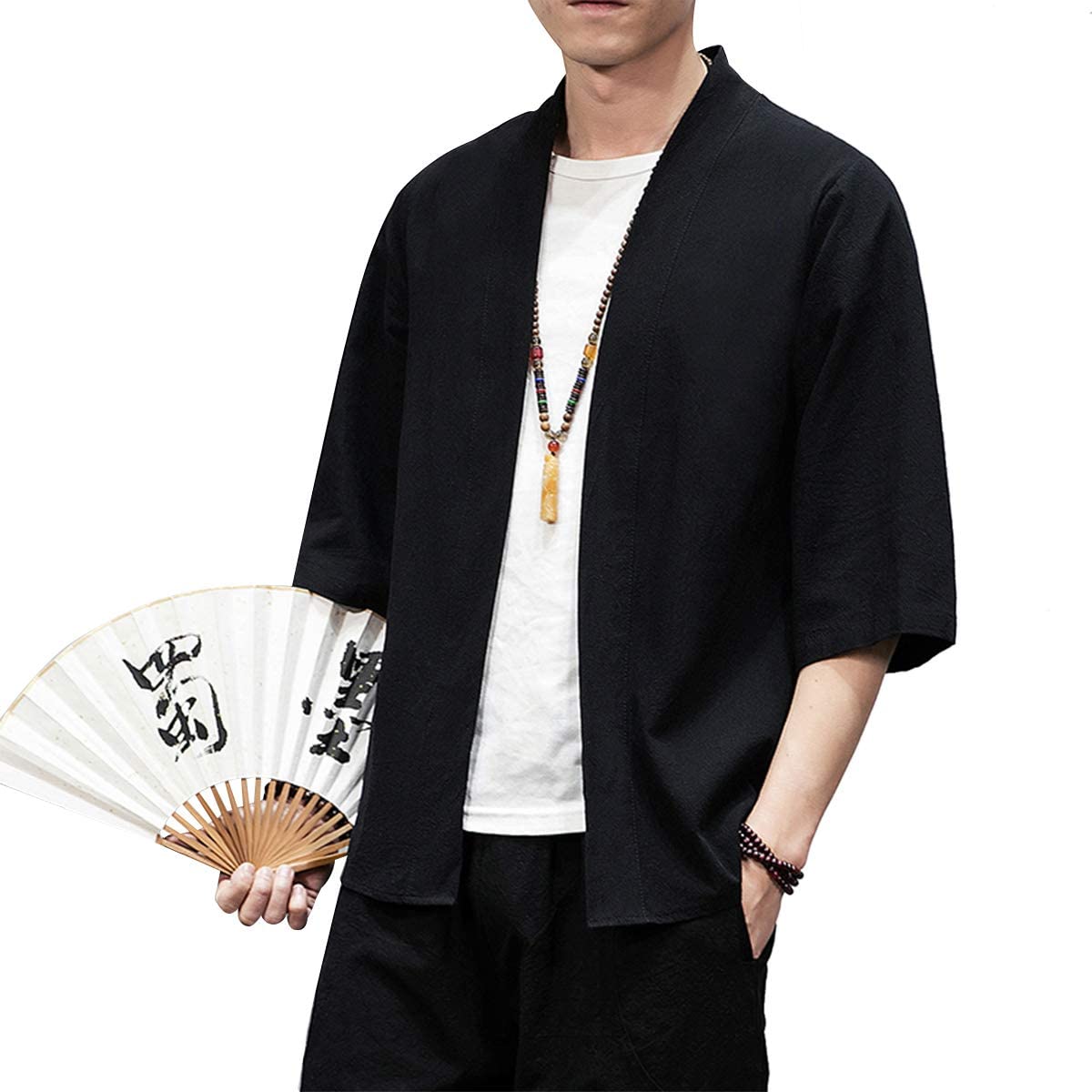 PRIJOUHE Men's Kimono Jackets Cardigan Lightweight Casual Cotton Blends Linen Seven Sleeves Open Front Coat Outwear