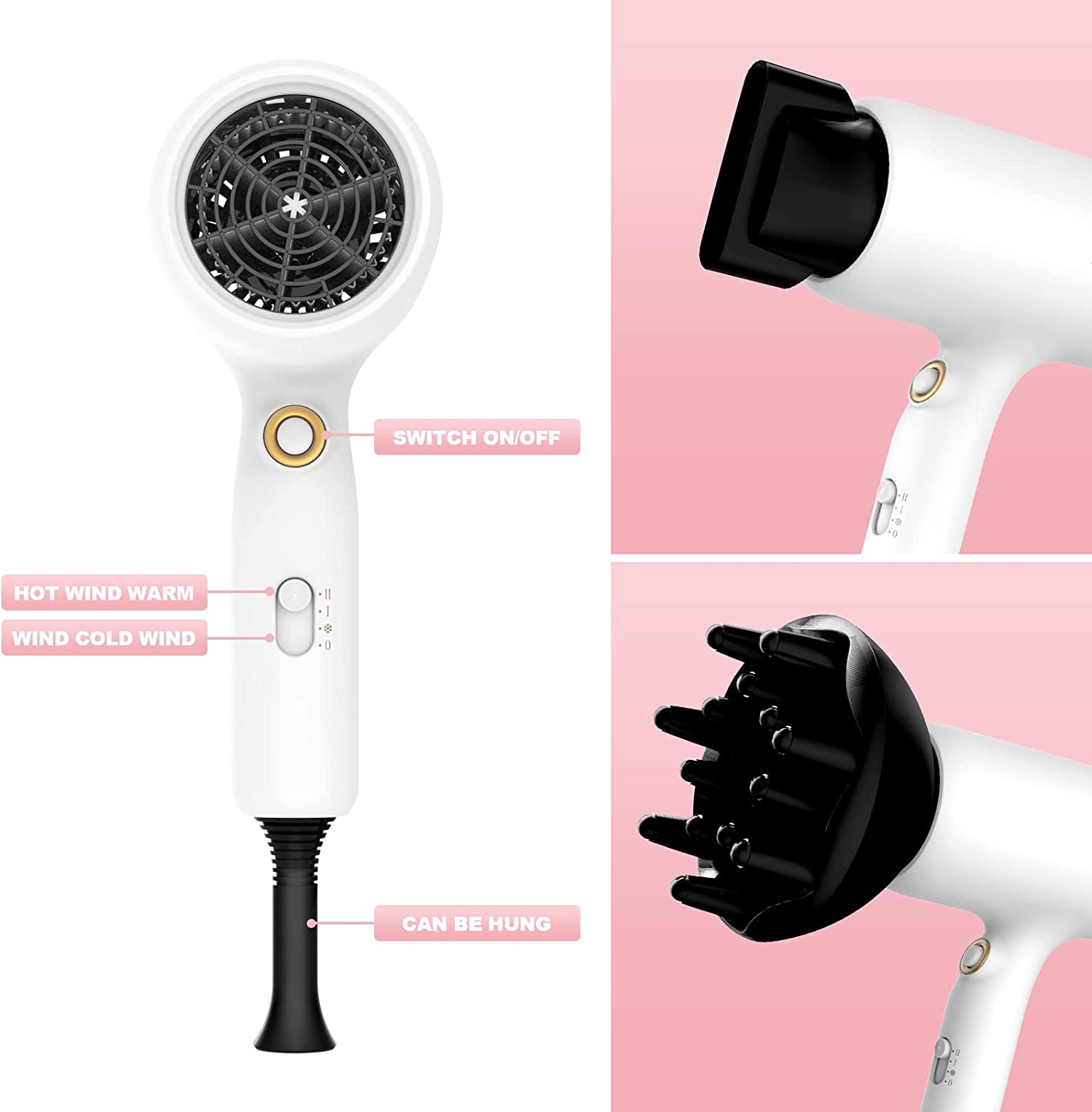 Professional Ionic Hair Dryer with Diffuser, DOOAIR 1875W Blow Dryer, Ionic Hair Dryer with Diffuser, Travel Hair Dryer, Constant Temperature Hair Care (White)