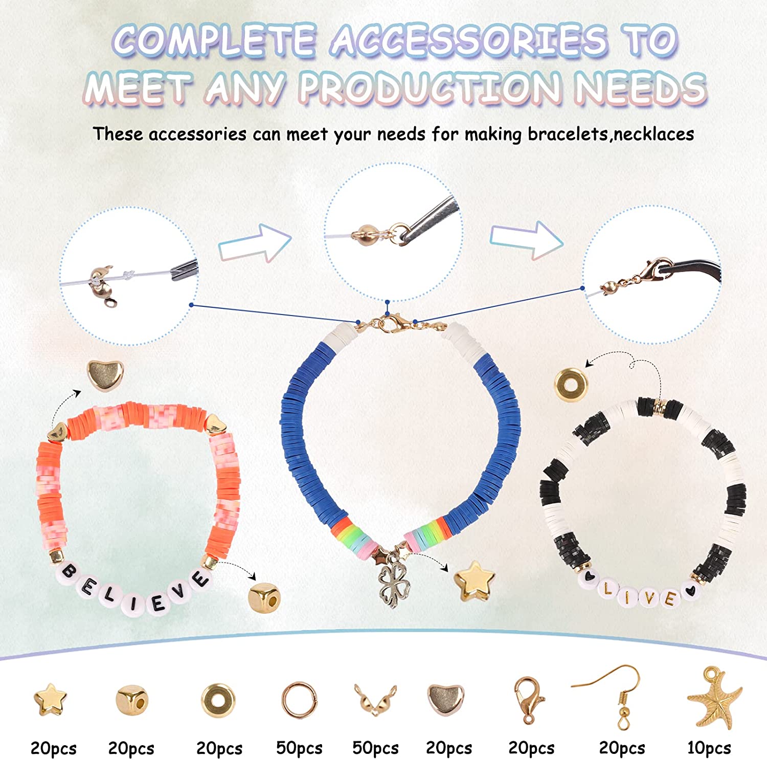QUEFE 42 Colors Clay Beads for Bracelet Making with Letter Smiley Face Peace Beads Different Styles Charms Pendants, Flat Round Polymer Clay Heishi Beads Kit with Elastic Strings for DIY Craft Jewelry