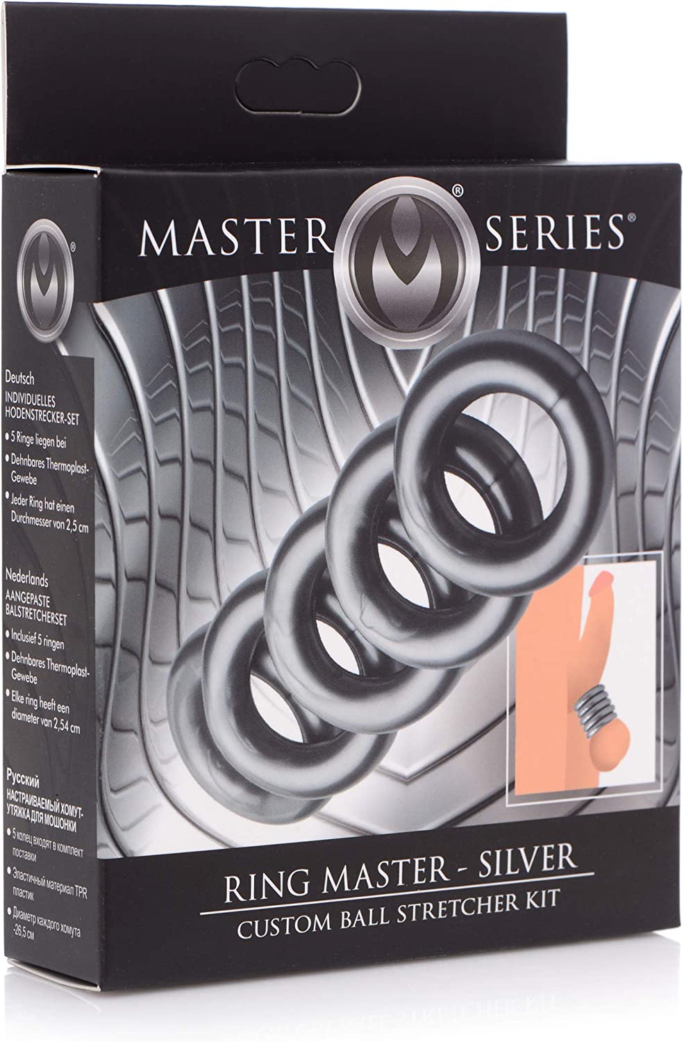 Discover new levels of pleasure with this customizable ball-stretching kit! Perfect for both beginners and those who want to push their limits, this set of 5 stretchy rings allows you to add tension one ring at a time. Find the perfect tugging sensation as your scrotum is pulled downward more and more with each ring you add. For even more excitement, use one as a cock ring to keep your member hard and pulsing with sensitivity while your balls are stretched.This ultra stretchy material provides convenience and a comfortable fit. It is compatible with both silicone and water-based lubricants. Clean after use with mild soap or toy cleaner.Measurements: Each ring is 1 inch in diameter, unstretchedMaterial: TPRColor: GreyNote: Includes 5 rings