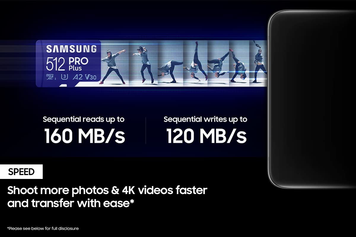Your new go-to card + adapter combo, the Micro SD PRO Plus + Adapter makes capturing seamless 4K video on compatible phones or drones a breeze. Plus, the expanded storage provides you the freedom to play more high performance and intensive games on your tablet or gaming device. It’s all the extra space you need from a brand you can count on. ¹Requires a compatible phone or drone capable of filming 4K video. ²Comparisons based on 2020 PRO Plus microSD models. *The foregoing read & write speed performance is based on testing of 512GB capacity under standard conditions; Actual speeds may vary depending upon card capacity; **Stated performance is achieved by using PRO Plus microSD cards with Samsung adapters, ³Waterproof: withstand up to 72 hours in seawater; ⁴Temperature proof: operating temperatures of -25 C to 85 C; non-operating temperatures of -40 C to 85 C; ⁵X-Ray Proof: up to 100mGy, equal to airport X-ray machines; ⁶Magnetic-Proof up to 15,000 gauss, or the magnetic field equivalent of a high-field MRI; ⁷Drop: withstand drops up to 5meters (16.4 feet). ⁸Wearout: up to 10,000 swipes. ⁹Source: 2003-Q3 2020 IHS Markit data: NAND suppliers' revenue market share.