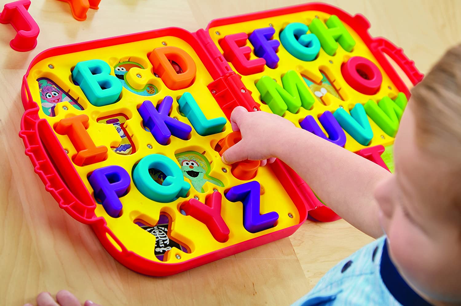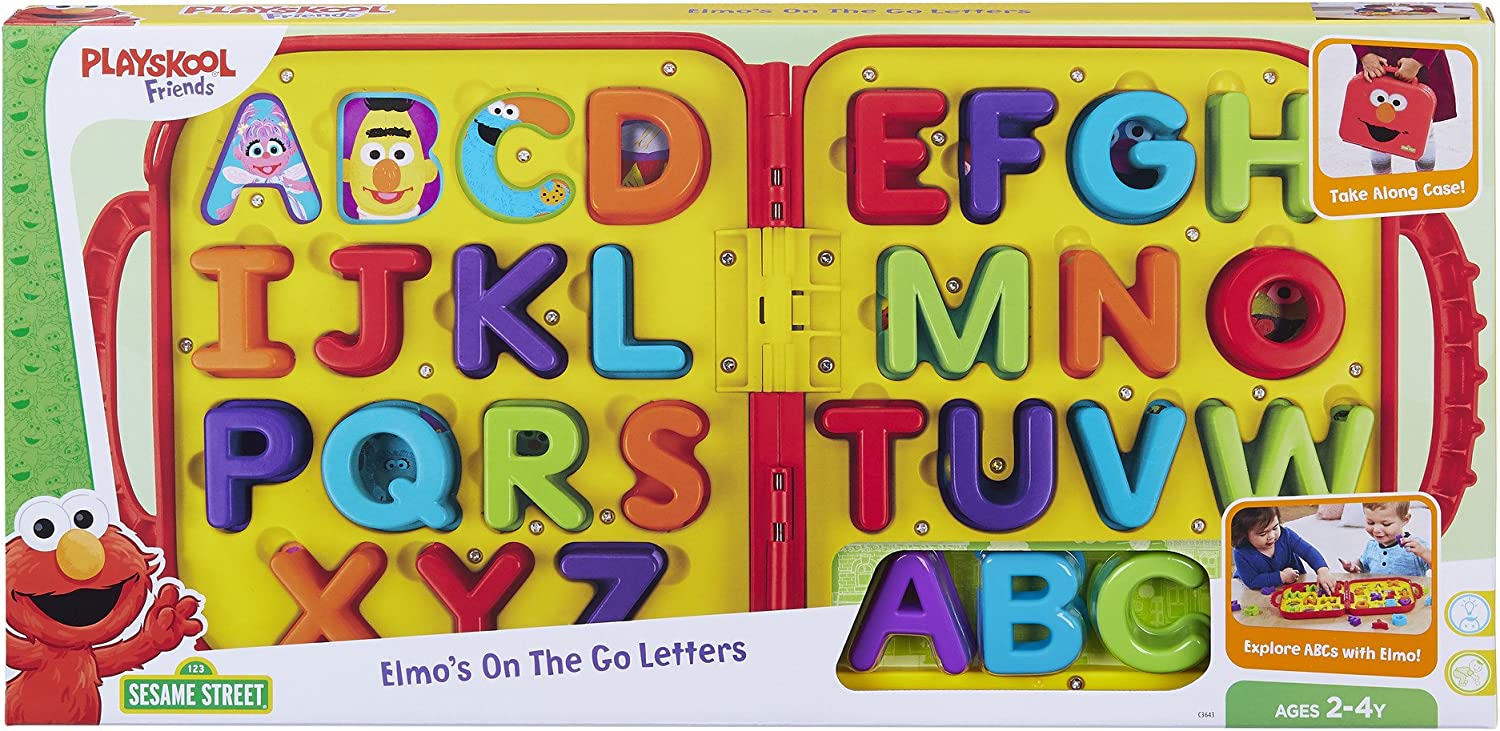 Preschoolers will love exploring the alphabet with their favorite Sesame Street characters in Elmo's On the Go Letters! Snap each letter into place, or mix them up to spell out simple words in the bottom window. Underneath each letter is an image of a word that starts with that letter. When play is done, fold up the Elmo carrying case, and take the alphabet on the go! Sesame Street and associated characters, trademarks and design elements are owned and licensed by Sesame Workshop. Hasbro and all related terms are trademarks of Hasbro.