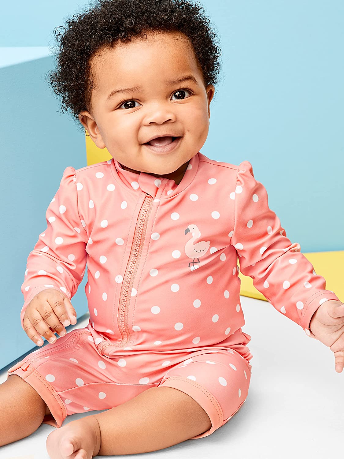 Help keep her covered from sun, sand + salt with these long-sleeve rashguards featuring a full zip front for easy on and off, mock necks, cute ruffles on the bum and sweet sea characters. Plus, a handy 2-pack means more fun in the sun!