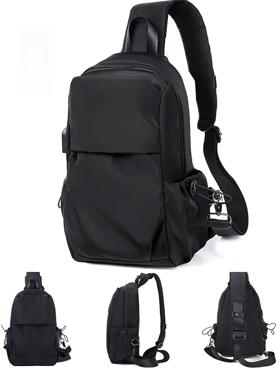 Small Black Sling Crossbody Backpack Shoulder Bag for Men Women, Lightweight One Strap Backpack Sling Bag Backpack for Hiking Walking Biking Travel Cycling USB Charger Port-Nylon