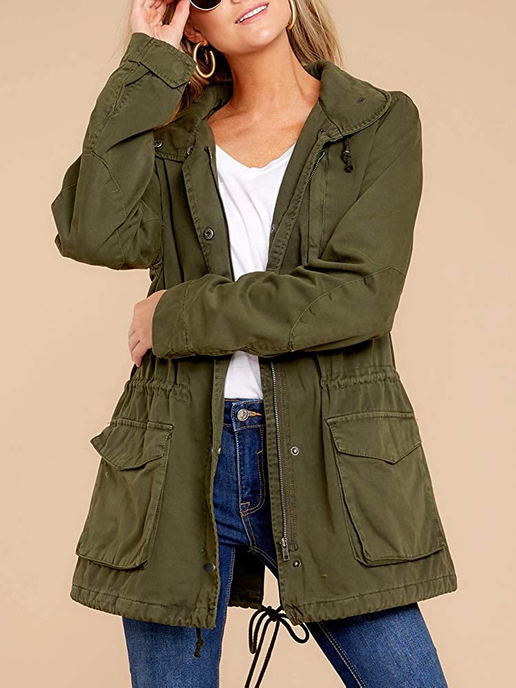 Soulomelody Womens Military Safari Anorak Jacket Hoodies Zip Up Parka Casual Drawstring Coat with Pockets
