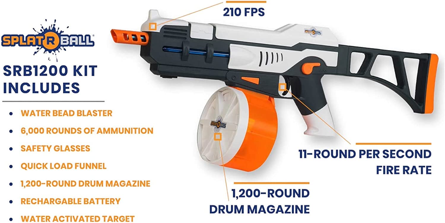 SPLATRBALL everything in your path with full auto water bead fire rate and a 1,200 round drum magazine! The SPLATRBALL SRB1200 Full Auto Water Bead Blaster shoots up to 210 feet per second (fps) SPLATRBALL ammo. It has a drum magazine with 1,200 round capacity. Shoots Certified 7.5mm SPLATRBALL water bead ammo at fire rate. This kit contains one Blaster, 1,200 round drum magazine, detachable stock, 6,000 rounds of SPLATRBALL water beads, rechargeable 7.4V 1800mAh battery with charging cable (up to 5,000 shots per battery charge), SPLATRBALL collapsible funnel for magazine quick loading, safety glasses and one water activated target.