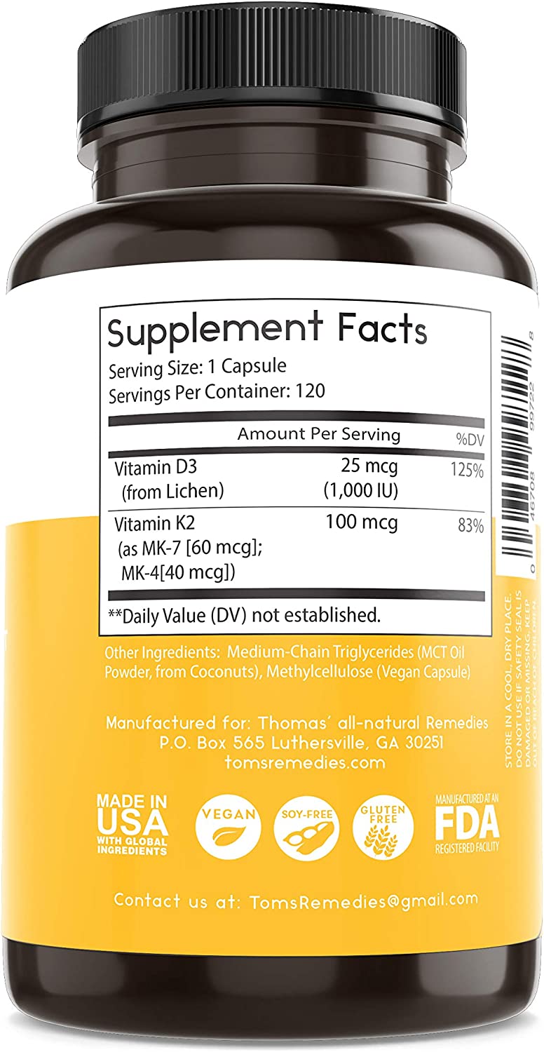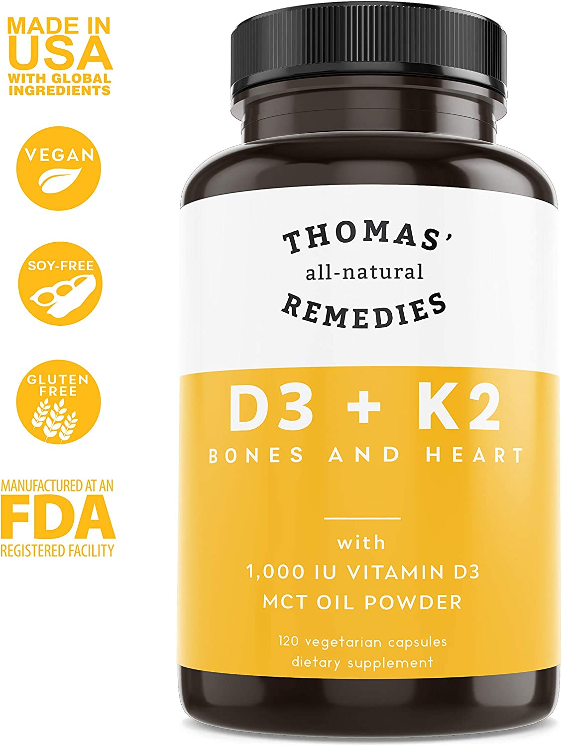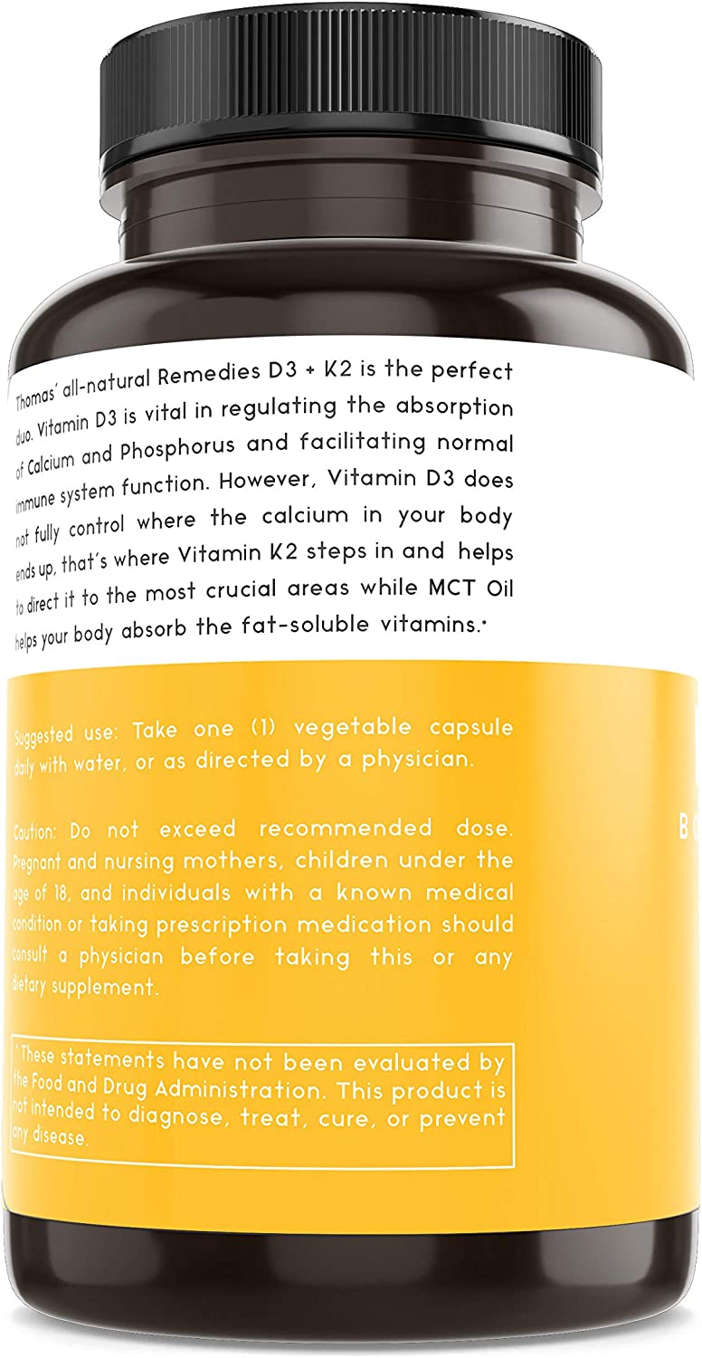 Thomas' all-natural Remedies D3 + K2 with MCT Oil for Better Absorption - 1000 IU D3 - Vegan - Made in USA - Support for Your Heart, Bones & Teeth - Non-GMO - 120ct