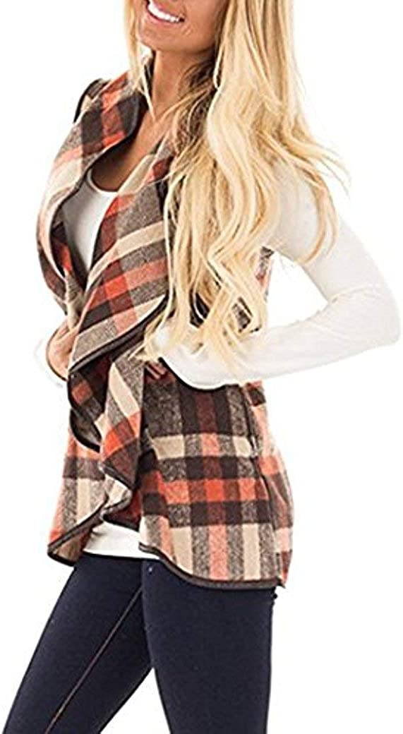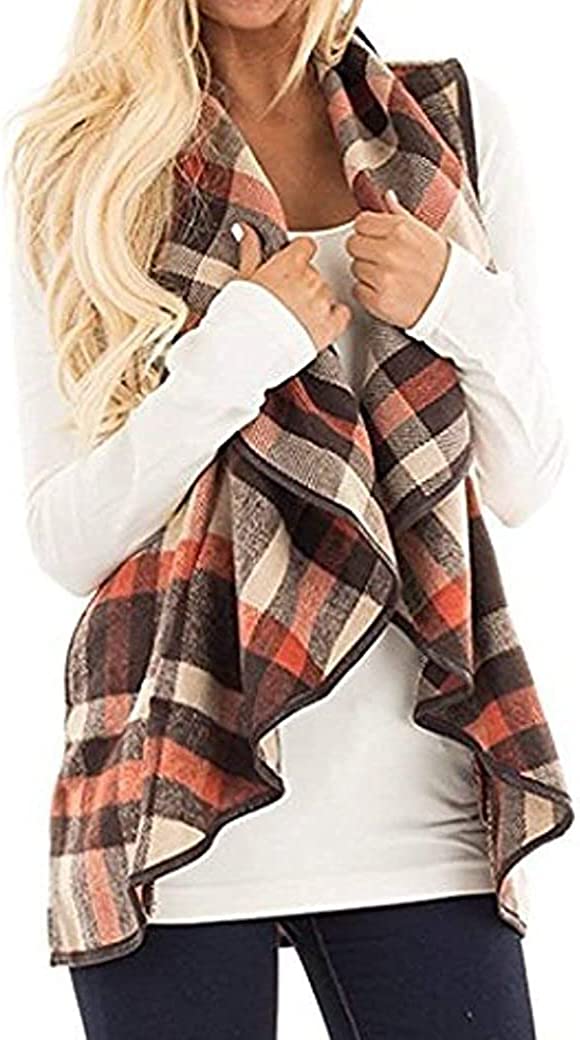 Unidear Womens Casual Lapel Open Front Plaid Vest Cardigan Coat with Pockets