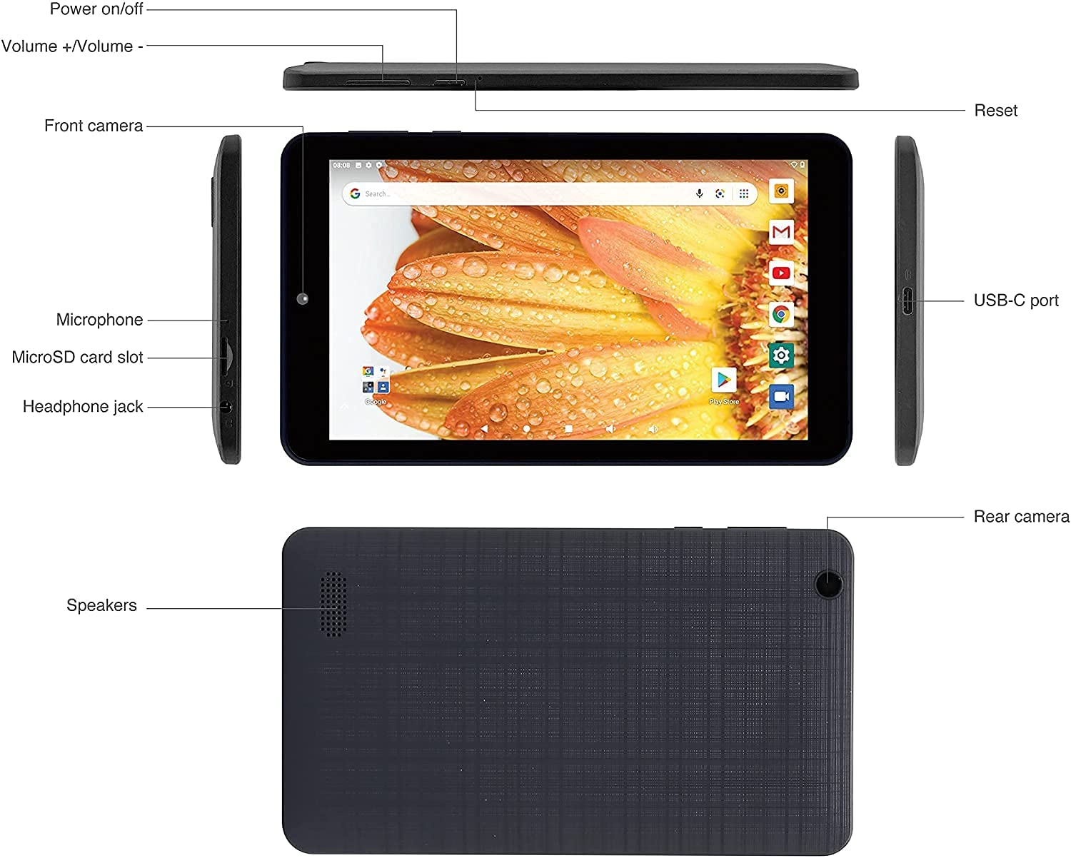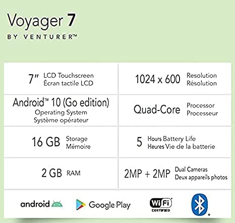 Upgraded with Android 10 Go Edition, the new Venturer Voyager 7” tablet boasts a crystal-clear 1024 x 600 touchscreen display. Multi-task and switch in and out of apps with ease thanks to the included 2GB of RAM. The onboard 16GB of storage can be expanded by 128GB using the microSD input. Connect to dual-band internet WiFi and instantly retrieve access to millions of apps available on the Google Play store. Pair the Voyager with an external speaker using Bluetooth. And don’t let distance keep you from connecting with loved ones and friends; simply use the front-facing camera to video chat and conference. Slim, lightweight, and easy to use, the Venturer Voyager makes for the perfect portable computing companion.