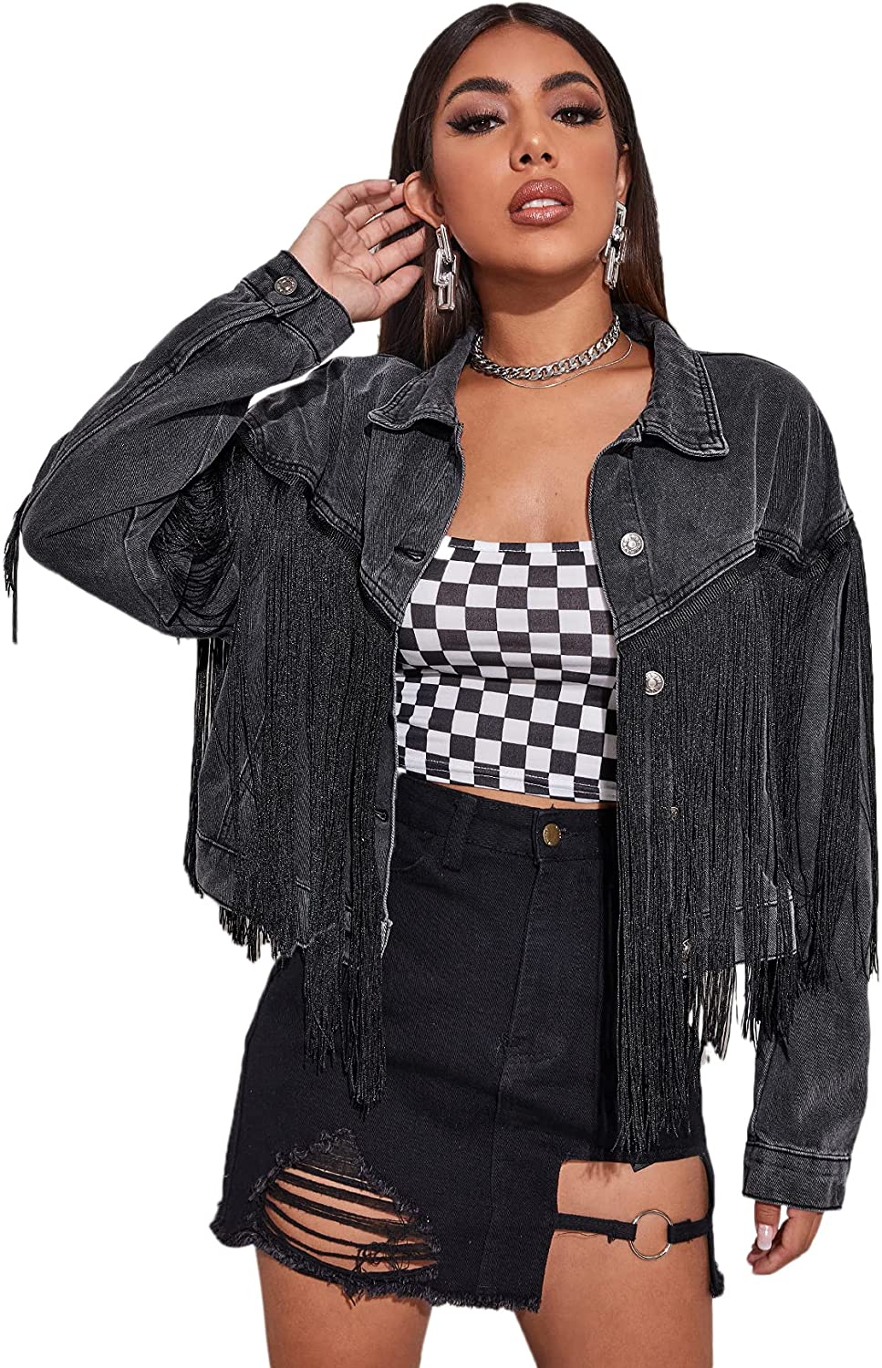 Verdusa Women's Button Front Fringe Trim Long Sleeve Drop Shoulder Denim Jacket