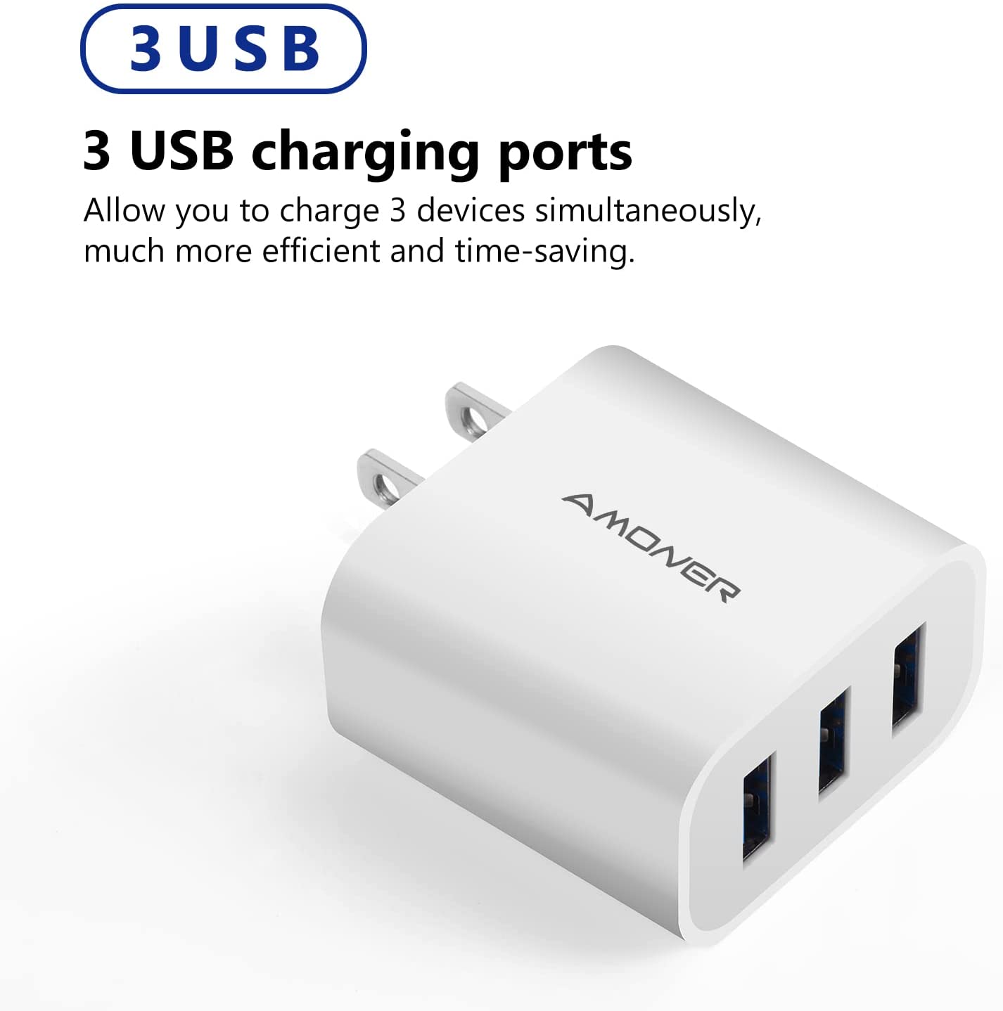 Wall Charger, Amoner Upgraded 2Pack 15W 3-Port USB Plug Cube Portable Wall Charger Plug for iPhone 12mini/12/11/Pro/ProMax/Xs/XR/X/8/7, iPad Pro/Air 2, Galaxy10/9, Note10/9, and More