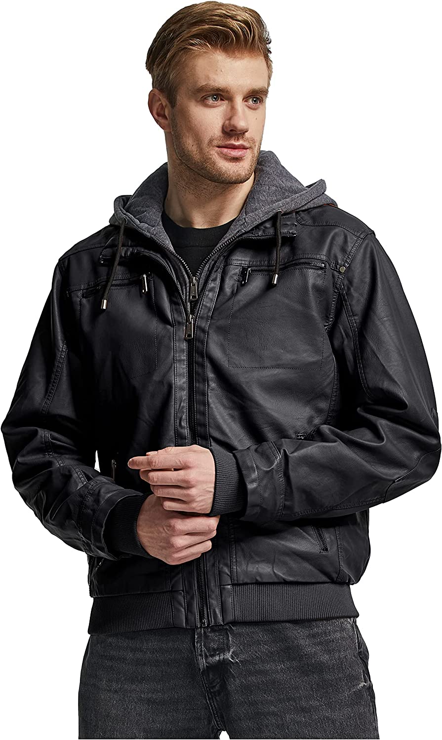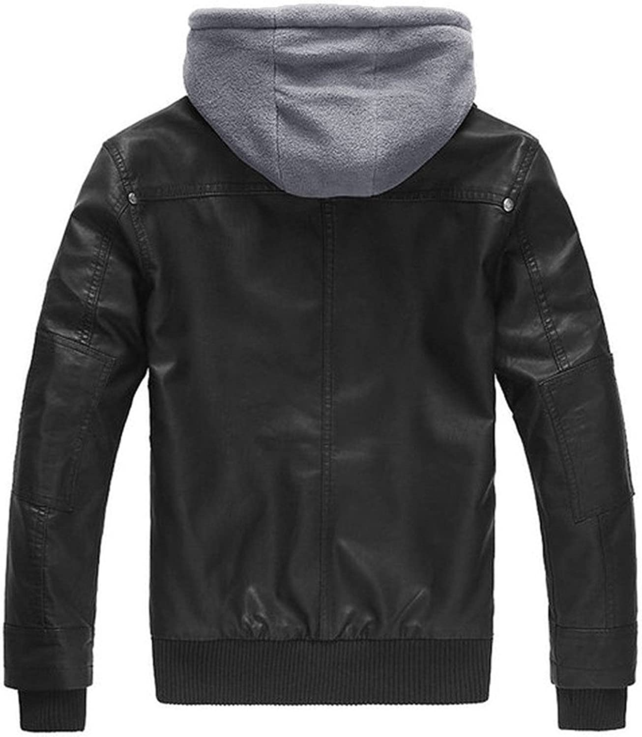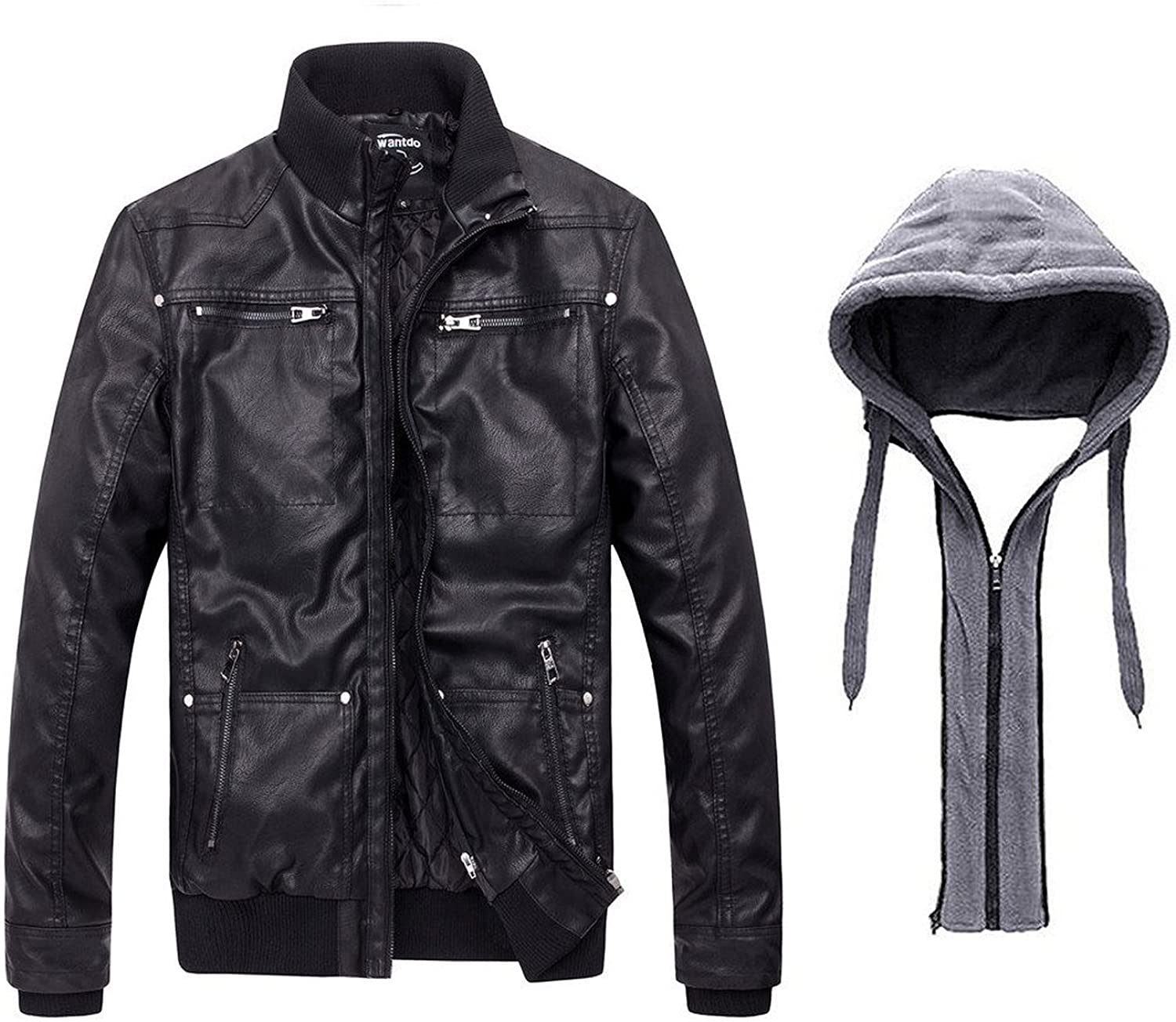 Wantdo Men's Faux Leather Jacket with Removable Hood Motorcycle Jacket Casual Warm Winter Coat