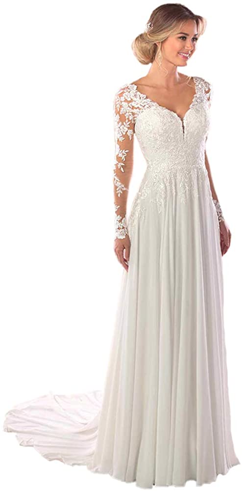 Wedding Dresses for Bride 2022 with Lace Appliques Chiffon Women Dress Long Sleeves Beach Bride Dress Ivory
