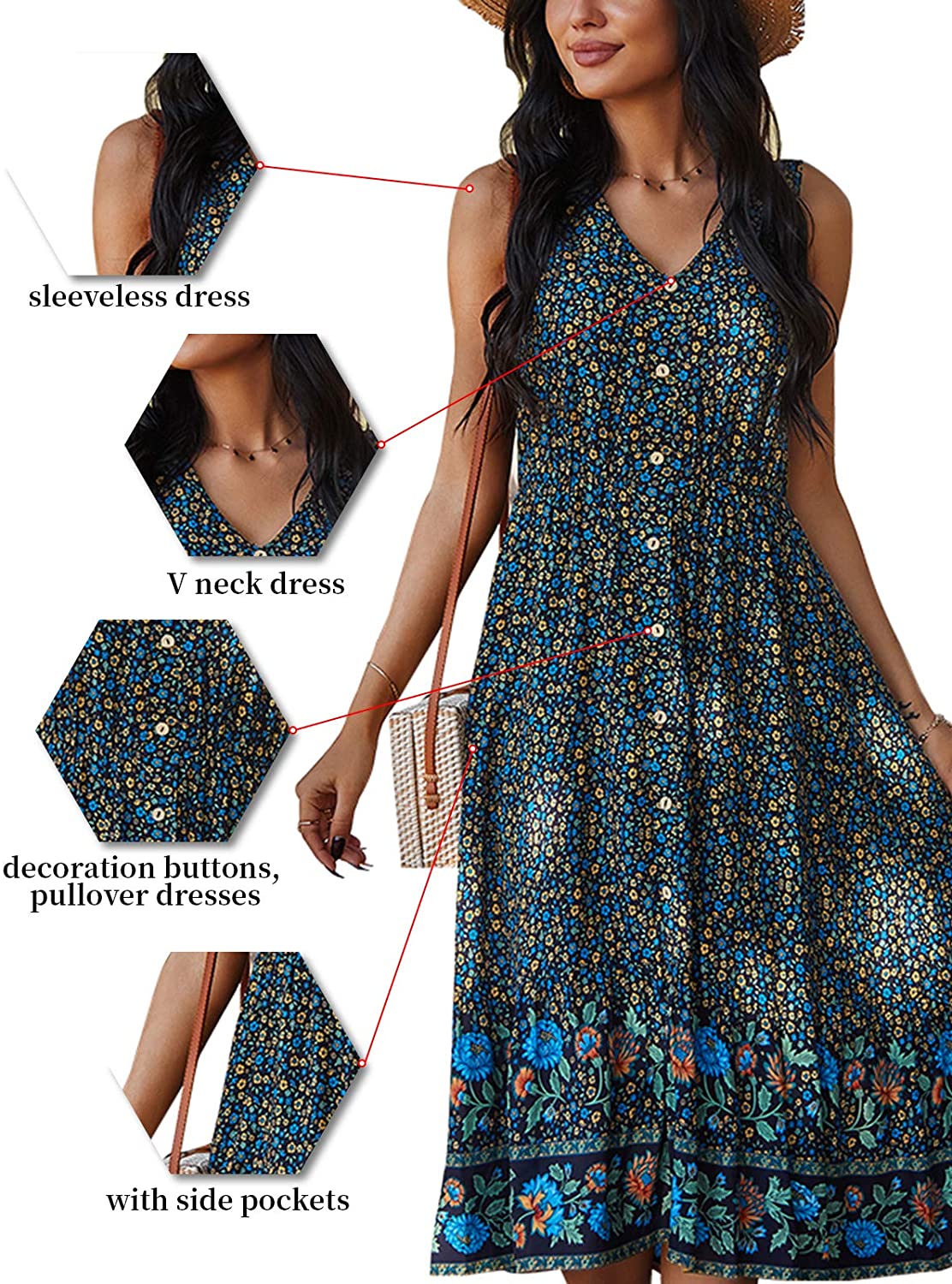 Women Dress Summer Sleeveless Floral Bohemian V Neck Button Down Flowy Dresses S-XL