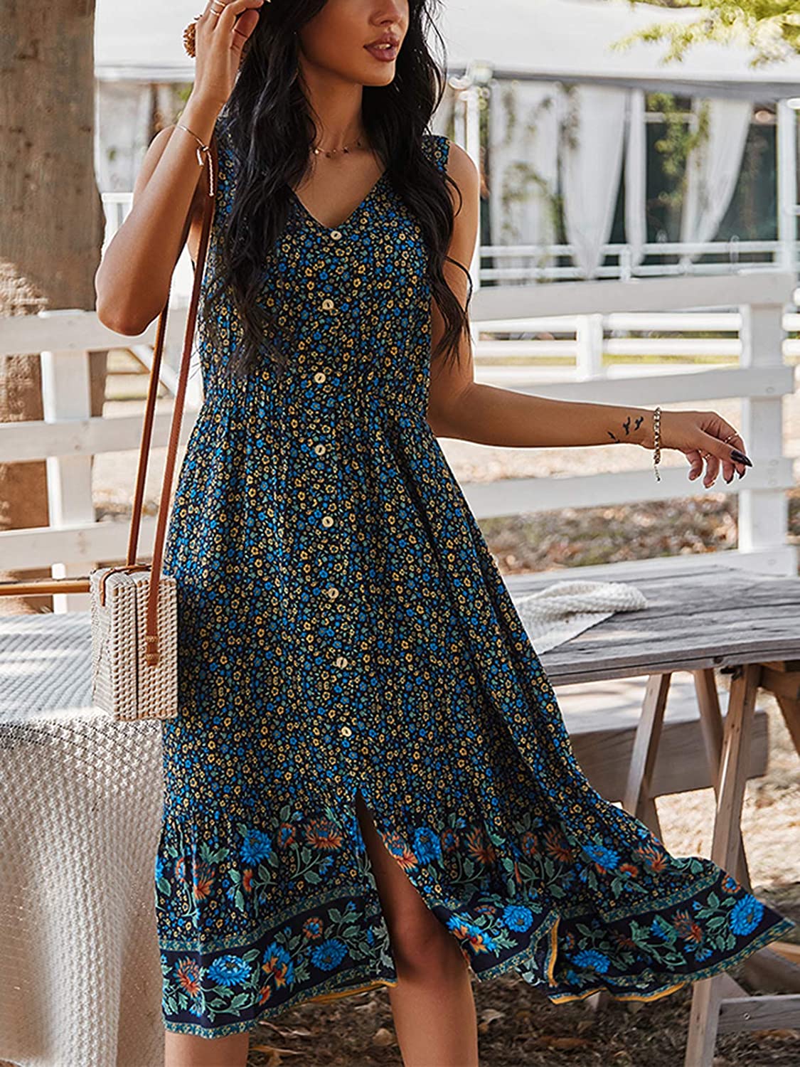 Women Dress Summer Sleeveless Floral Bohemian V Neck Button Down Flowy Dresses S-XL