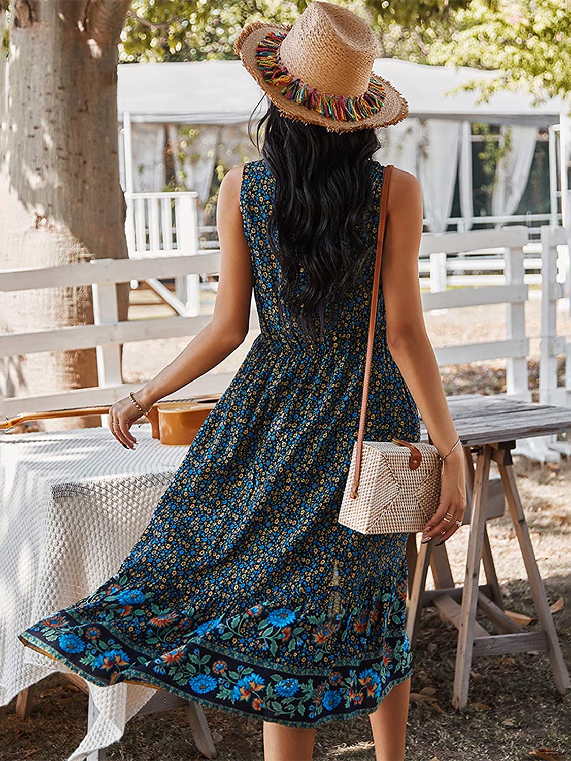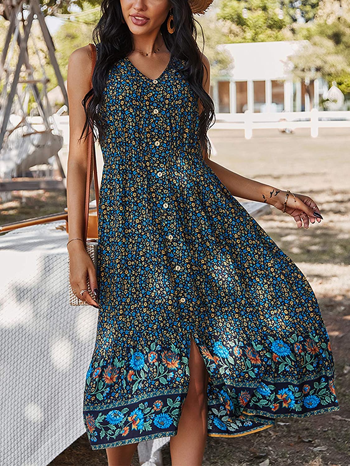Women Dress Summer Sleeveless Floral Bohemian V Neck Button Down Flowy Dresses S-XL