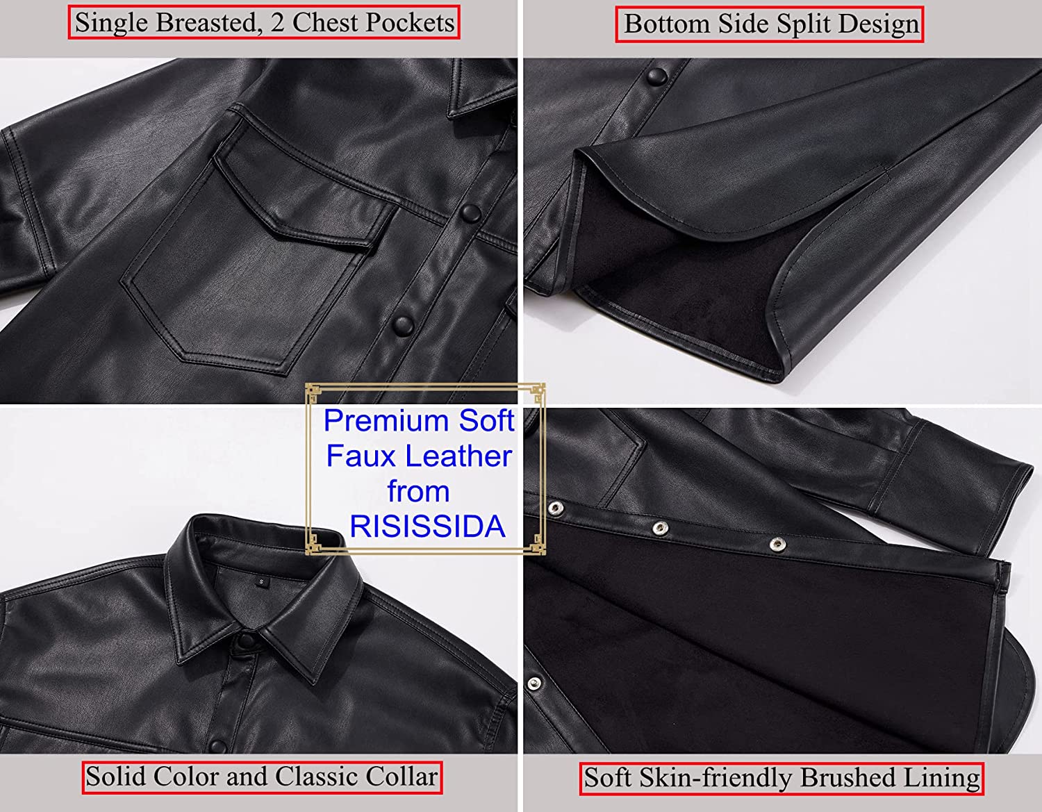 Women Faux Leather Shacket Jacket Blouses 2022 Spring and Fall Fashion, RISISSIDA Button Down Shirts with Breast Pockets
