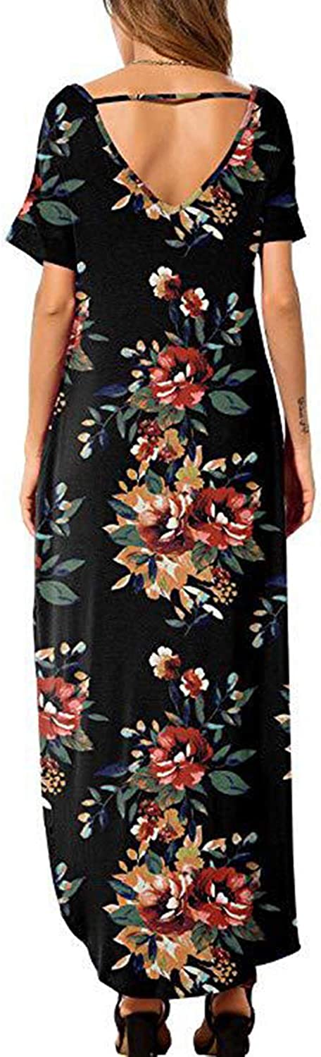 Women Summer Casual Maxi Dress Loose Pockets Short Sleeve Split Boho Dresses