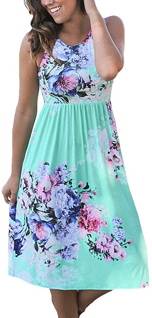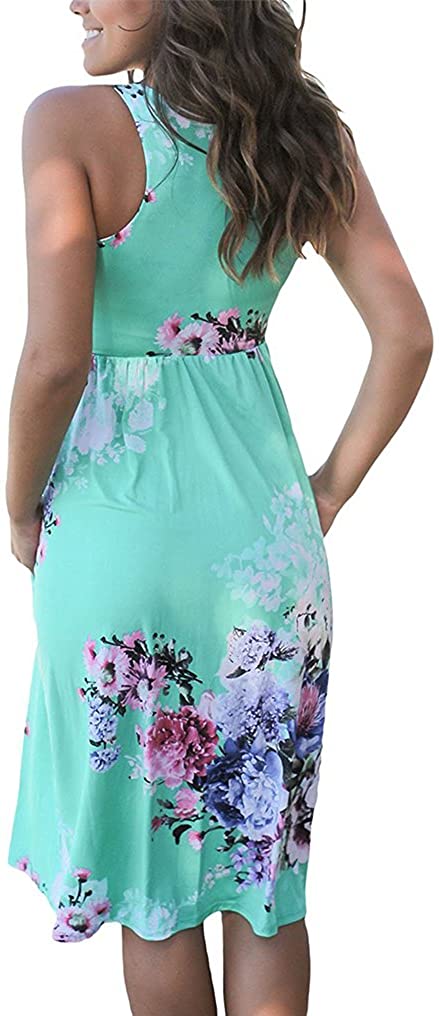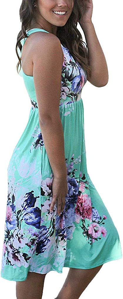 Women Summer Sleeveless Floral Print Racerback Midi Sun Dresses with Pocket
