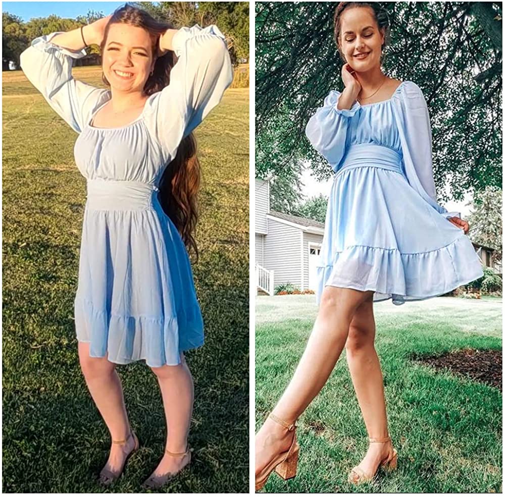 Women Tie Back Summer Dresses Long Lantern Sleeve Square Neck Ruffle Elastic Waist Aline Casual Mini Dress