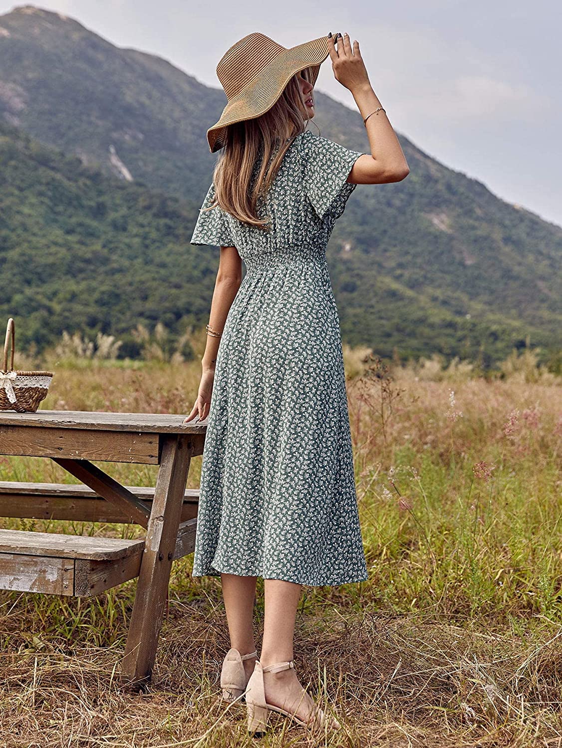 Women's Boho Ditsy Floral Short Sleeve A Line Flared Midi Dress