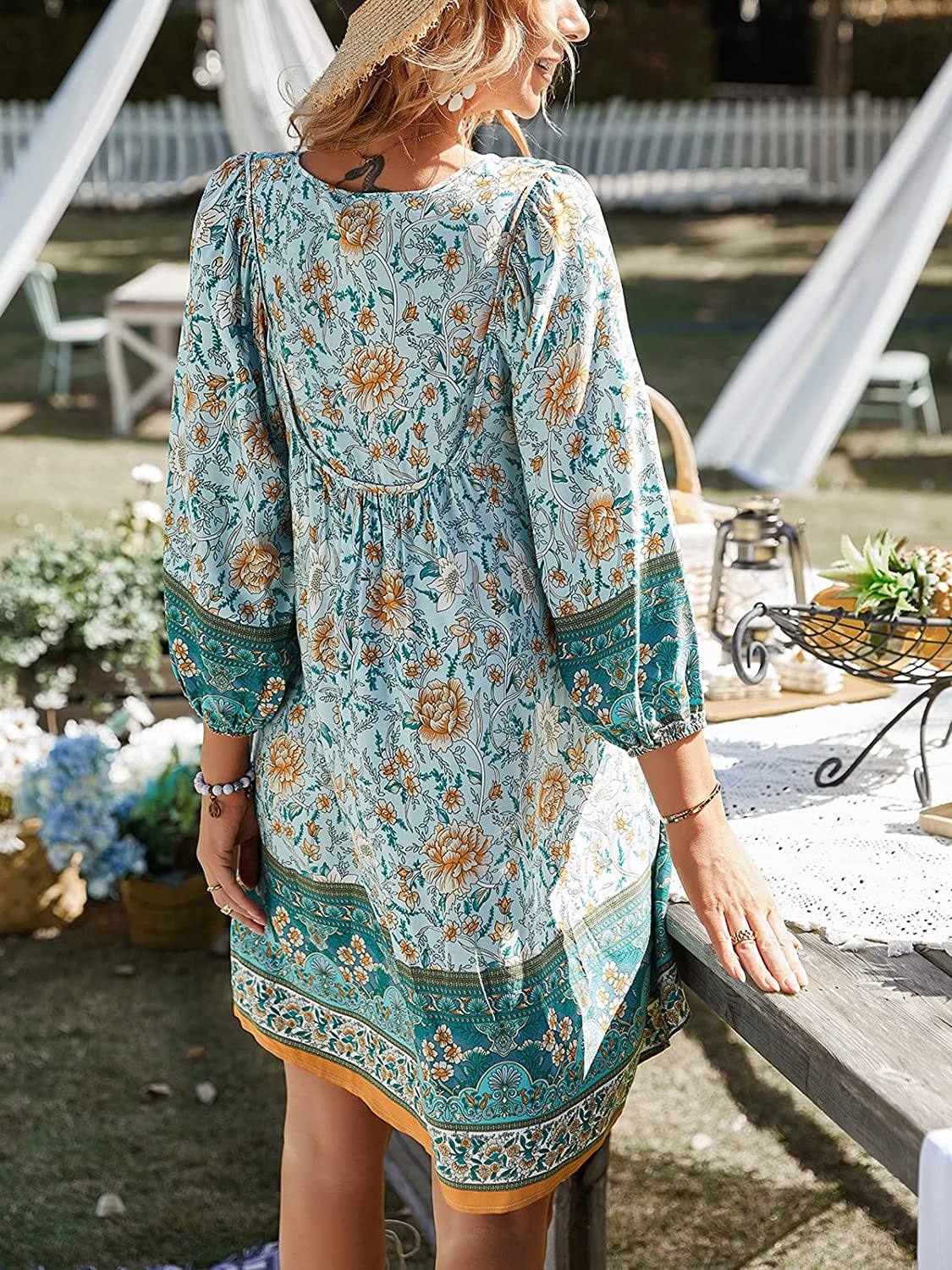 Women's Boho Dress Summer Mini Floral 3/4 Long Sleeve V Neck Flowy Loose Casual Beach Dresses