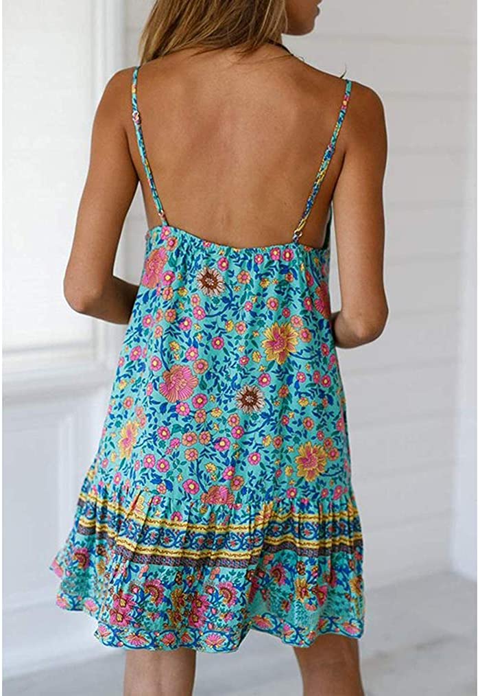 Womens Boho Floral Printed Dress Summer Sleeveless Adjustable Strap Beach Mini Dress with Pockets